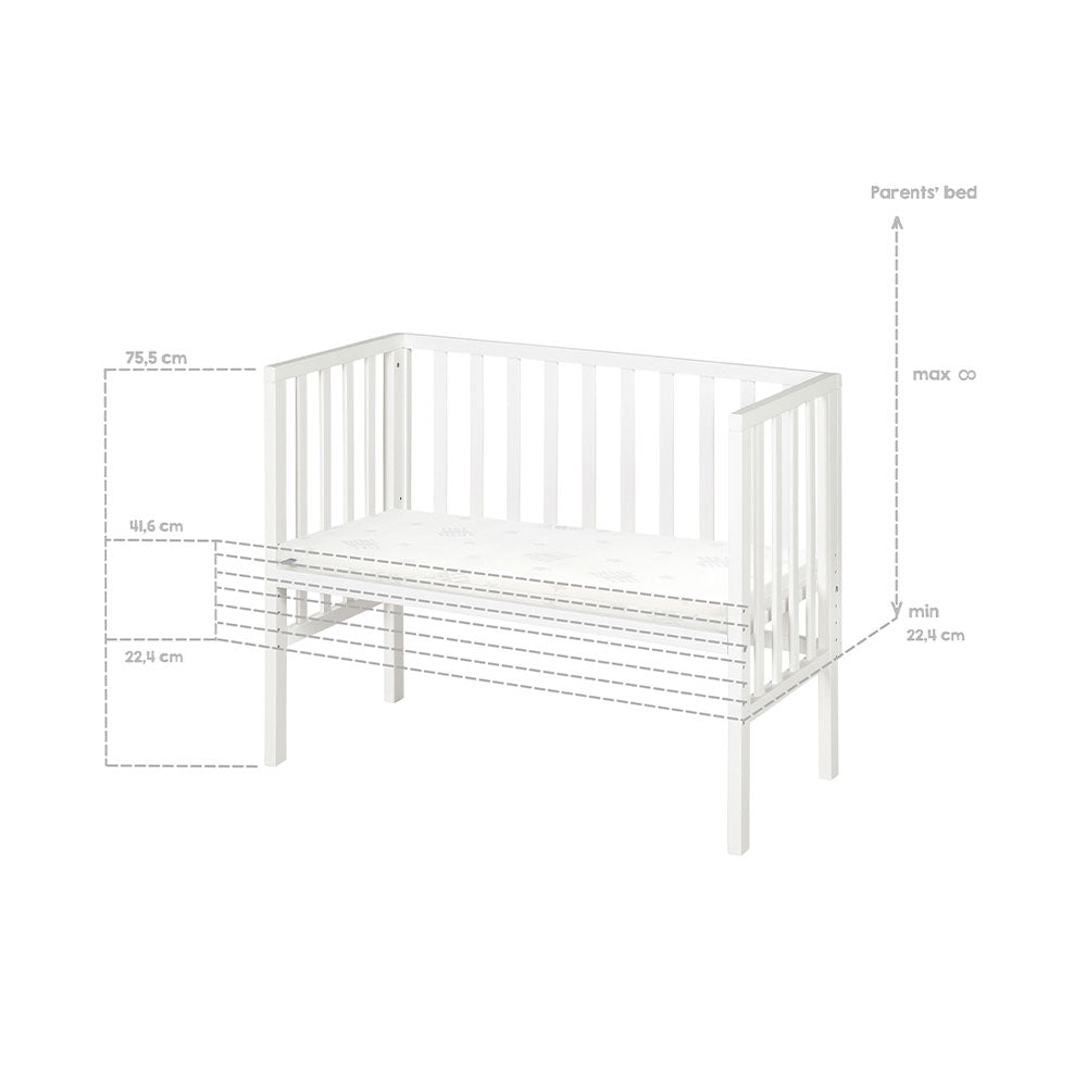 Die Matratze ist ca. 5 cm dick und bietet den nötigen Komfort für süsse Träume. Außerdem kannst du die Höhenverstellung ganz einfach an dein Bett anpassen, sodass ihr entspannt nebeneinander schlafen könnt. Egal, ob du im Wohnzimmer oder im Schlafzimmer bist, dieses Beistellbett ist nicht nur praktisch, sondern auch ein echter Hingucker. Mach dich bereit für ruhige Nächte und kuschelige Momente mit deinem kleinen Schatz!, , , Produktinformation, , Altersbereich: 0 - 6 Monate, Stilvolles Design, Passend für alle Elternbetten, Sicher & zuverlässig, Hochwertige Matratze, Bezug bei 60 Grad waschbar, Verstellbare Stufen