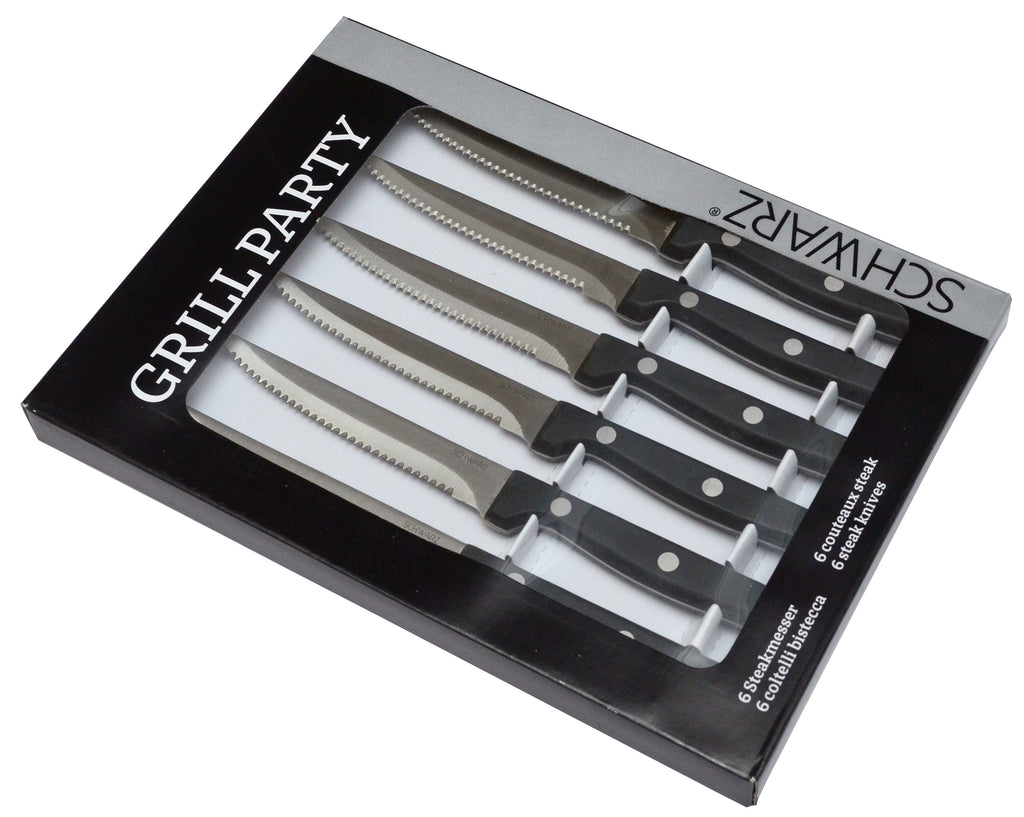 Das Set besteht aus 6 Steakmesser. Der Griff ist aus PoyOxyMethylen, das ist ein sehr wiederstandsfähiger und formstabiler thermoplastischer Kunststoff mit angenehm weicher Haptik.