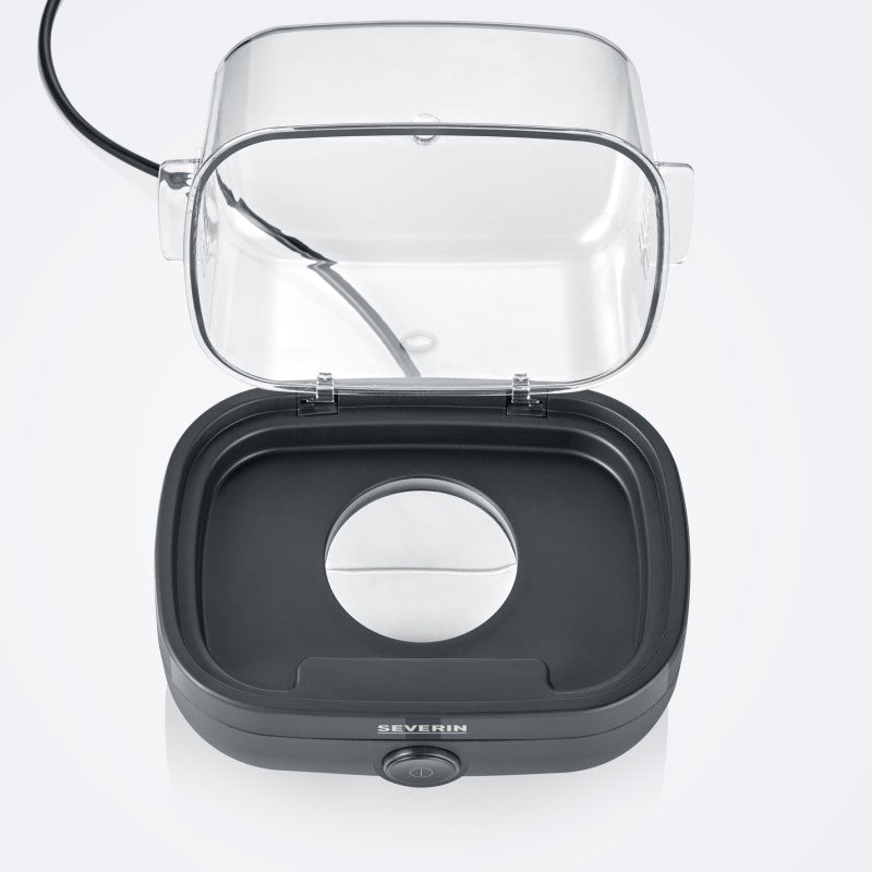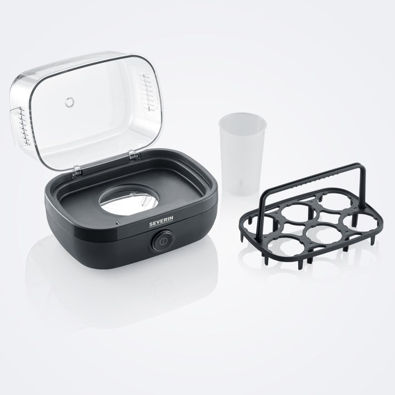 Die transparente und klappbare Haube erleichtert die Reinigung des Geräts und die Verwendung von 100% BPA-freien Materialen garantiert Ihnen einen unbedenklichen Genuss. Inklusive erhalten Sie einen Messbecher und Eierstecher inklusive.