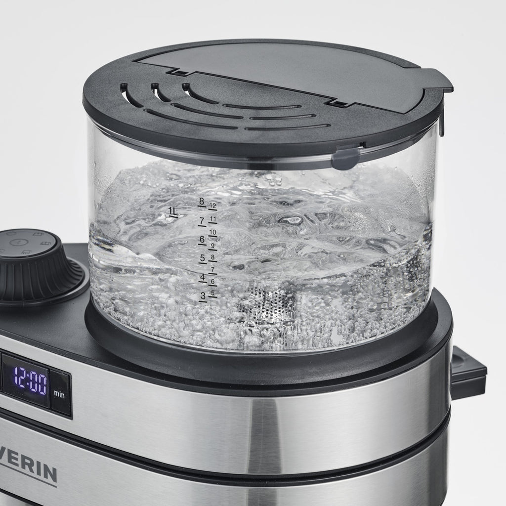 • Hochwertiges Volledelstahl-Design mit transparentem Glas-Wassertank