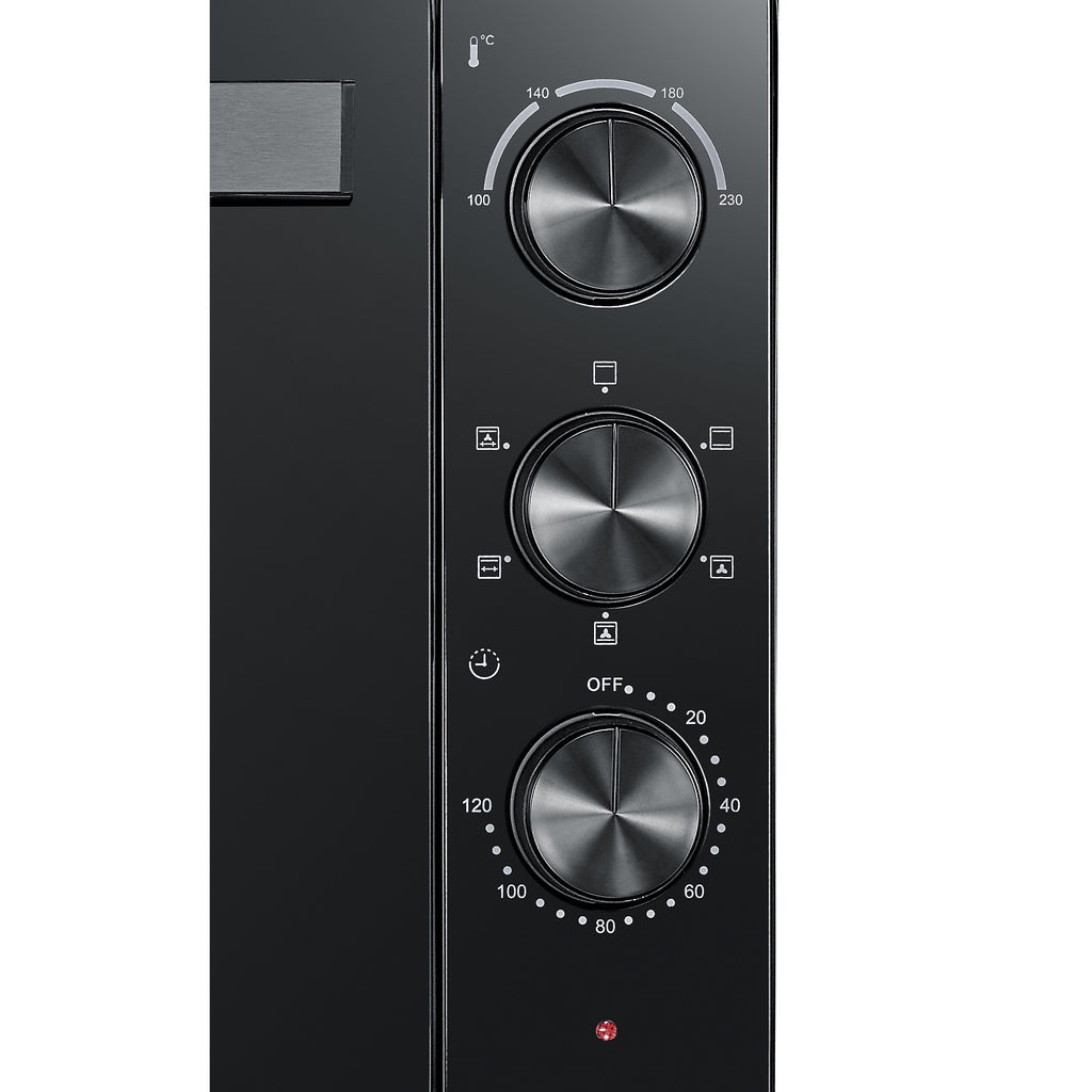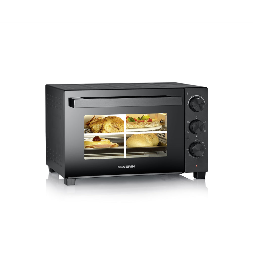 Der Severin TO2075 Back- und Toastofen bietet mit seinem 30-Liter-Garraum ausreichend Platz für Pizza, Pommes, Brötchen, Kuchen oder Aufläufe und eignet sich auch hervorragend für grössere Portionen. Die integrierte Umluft-Funktion sorgt für eine gleichmässige Hitzeverteilung und optimale Backergebnisse, während der praktische Drehspiess ideal für die Zubereitung von ganzen Hähnchen oder Fleischspiesse ist. Ober- und Unterhitze lassen sich je nach Bedarf separat oder kombiniert einstellen, und der grosse Temperaturbereich von 100 bis 230 °C ermöglicht vielseitige Zubereitungen. Der integrierte Timer mit bis zu 120 Minuten Laufzeit und Signalton sowie die automatische Abschaltung sorgen für komfortable und sichere Bedienung. Mit seinen kompakten Aussenmassen von 48,5 × 37,5 × 31,0 cm passt der Backofen problemlos in jede Küche und bietet dennoch viel Platz im Innenraum.