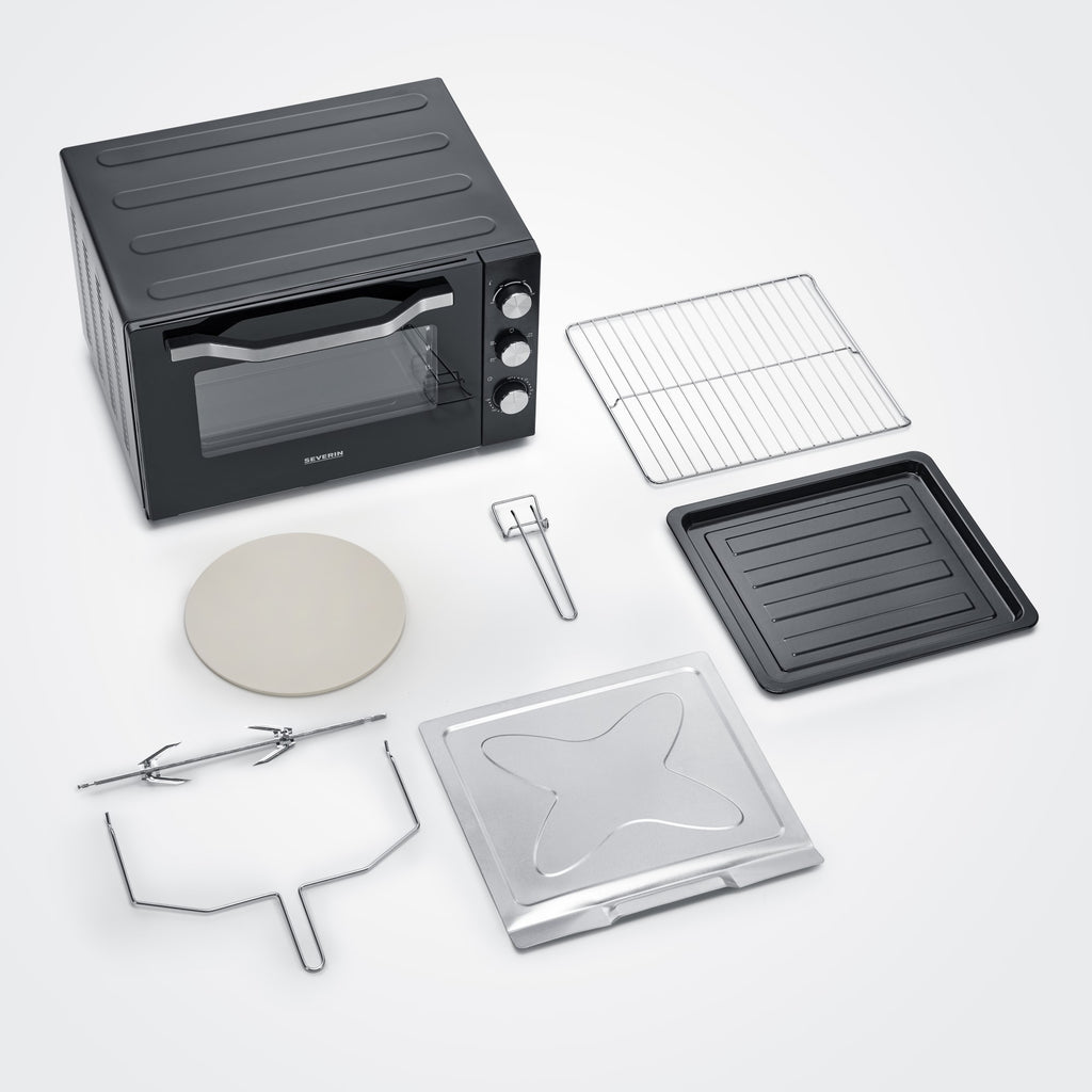 Lieferumfang Kleinbackofen, Pizzastein, Drehspiess, Backblech, Grillrost, Krümelblech und Entnahmegriffe