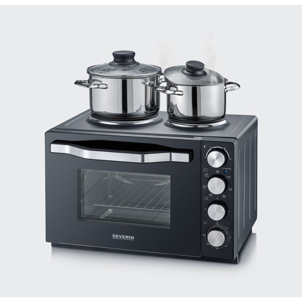 Kompakte Kombination eines vollwertigen Backofens mit zwei Kochplatten, zum Kochen, Grillen und Backen mit nur einem Gerät. Einfache Zubereitung von Grillhähnchen. Durch Grillfunktion mit enthaltenem Drehspieß und Drehspießantrieb, vielfältige Zubereitungsmöglichkeiten von Pommes bis Kuchen. Dank Ober-/ Unterhitze, Umluftfunktion und mitgeliefertem Grillrost und Backblech, weitere Zubereitungsmöglichkeiten mit Kochtopf oder Bratpfanne, auf beiden Platten gleichzeitig, alternativ bei eingeschaltetem Backofen auf der kleinen Platte.
