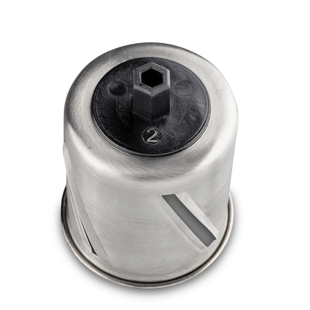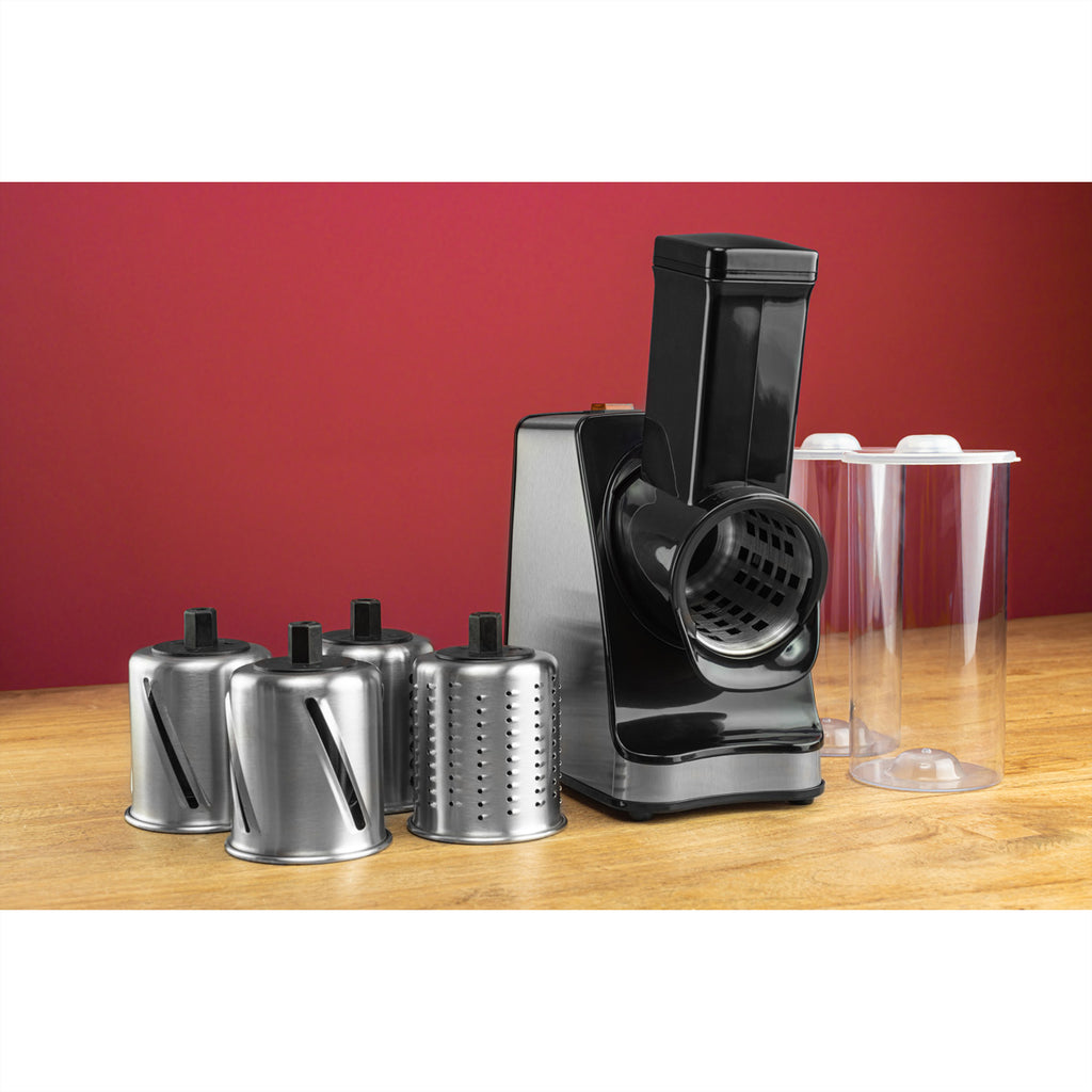 Angetrieben von einem 350-Watt-Motor schneidet dieser Reibschnitzler rohe und harte oder gekochte und weiche Zutaten in kürzester Zeit in feine oder grobe Stücke. Wählen Sie einfach die hohe Geschwindigkeitsstufe für harte und rohe Lebensmittel, um die Leistung zu erhöhen. Die Trommeleinsätze für dünne und dicke Scheiben eignen sich für viele Arten von Gemüse und Obst.