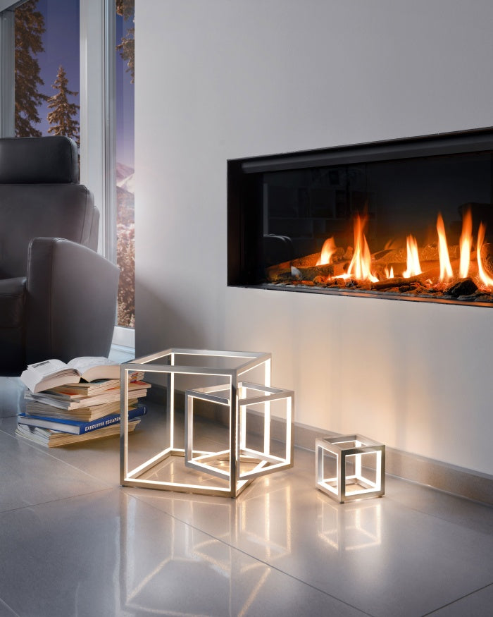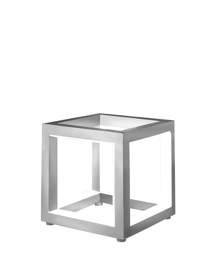 Die würfelförmige LED Tischleuchte DELUX ist aus Aluminium gefertigt. Die LED Beleuchtung des Lichtobjekts befindet sich auf den Innenseiten des Würfels.