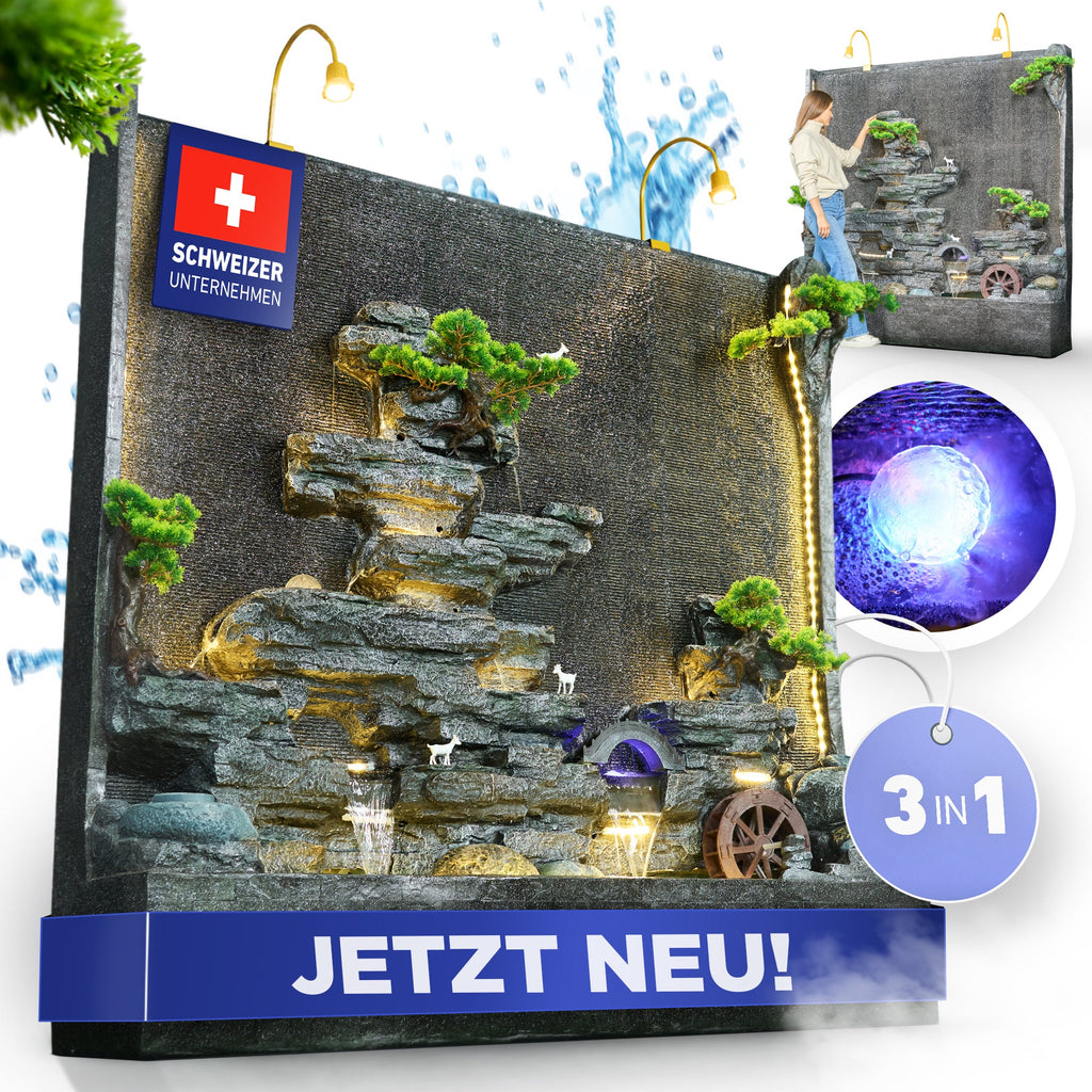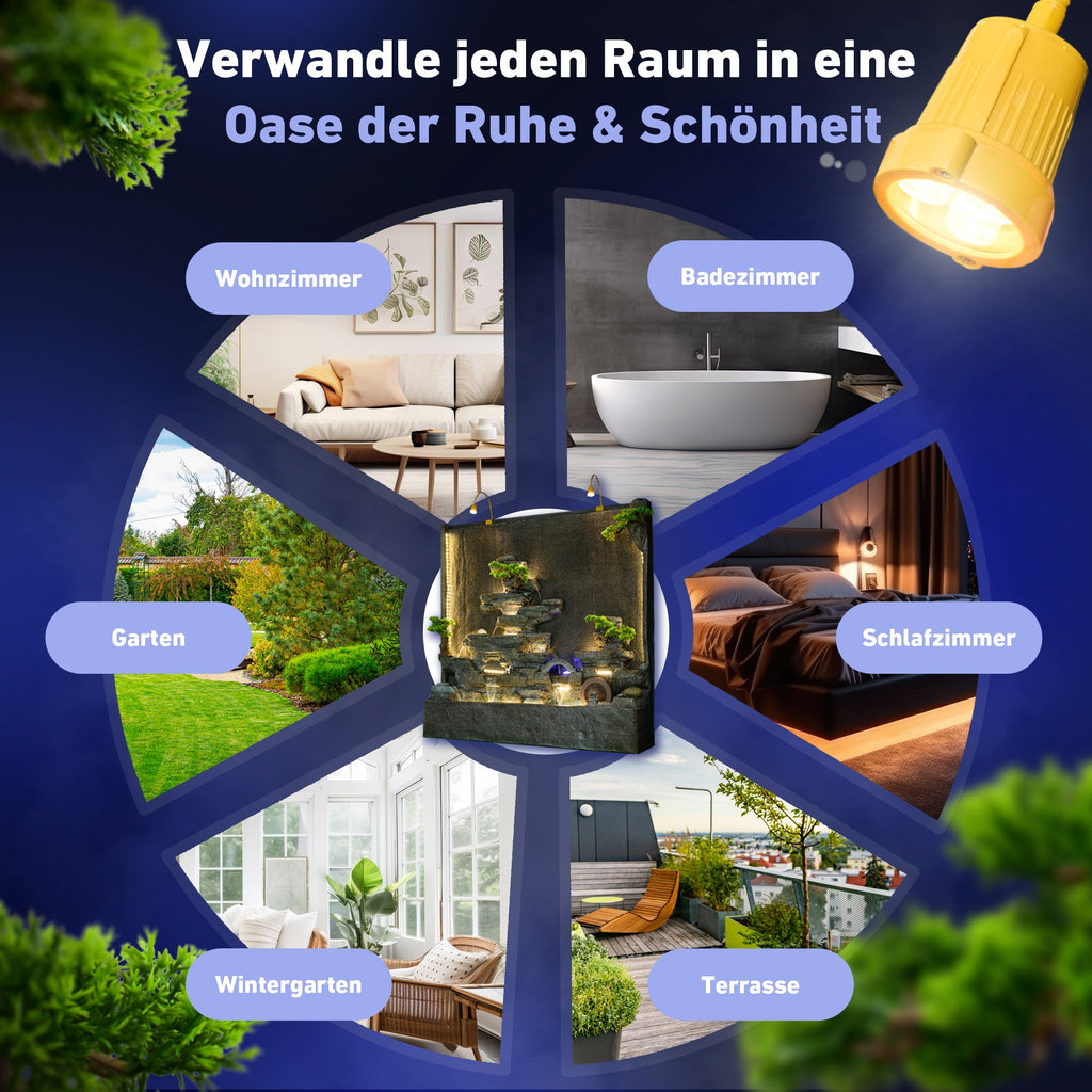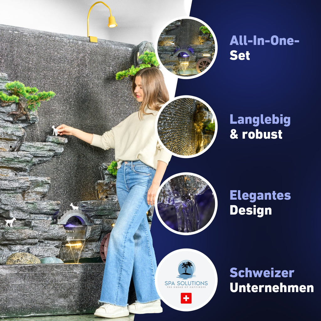 15 Verschiedene Wasserfälle: Der High End Wasserbrunnen Roma verfügt über nicht weniger als 15 verschiedene Wasserfälle, die in perfekter Harmonie miteinander fließen. Jeder Wasserfall ist einzigartig gestaltet und erzeugt ein beruhigendes, melodisches Rauschen, das die Sinne verzaubert und die Seele erfrischt.