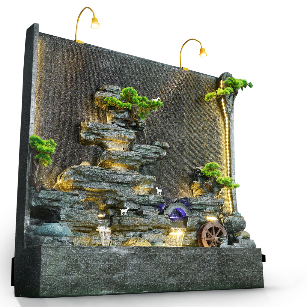 Drehende Glaskugel und Holzwasserrad: Die drehende Glaskugel in der Mitte des Brunnens fängt das Licht ein und erzeugt funkelnde Reflexionen, während das drehende Holzwasserrad einen Hauch von Nostalgie und Handwerkskunst hinzufügt. Diese Details verleihen dem Brunnen einen einzigartigen Charme und Charakter.