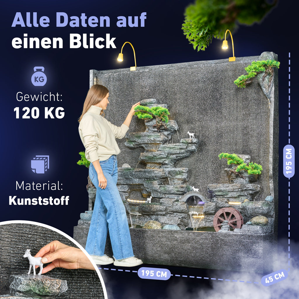 Für den Betrieb benötigen Sie keinen Wasseranschluss, lediglich einen Standard 230V-Anschluss, um die Pumpen sowie das LED-Licht und die Nebelmaschine anzuschließen. Es ist ratsam, eine Zeitschaltuhr zu benutzen, damit der Brunnen vollständig automatisch läuft und keine manuelle Intervention mehr erforderlich ist.