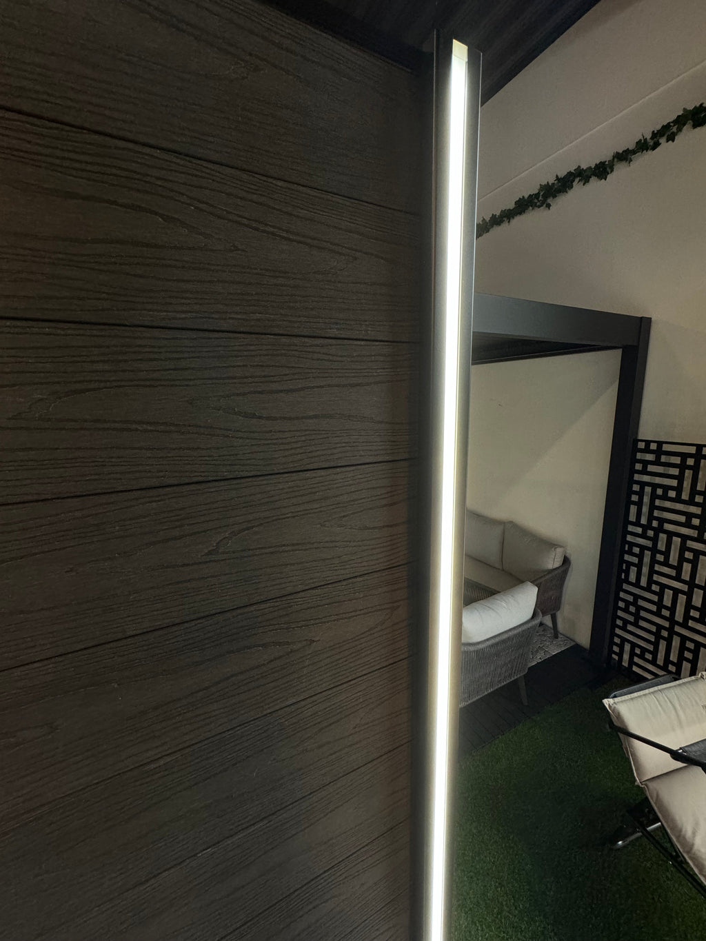 Unsere moderne Sichtschutzwand bietet nicht nur Privatsphäre und Schutz vor neugierigen Blicken, sondern setzt durch ihre integrierten LED-Beleuchtungsstreifen auch ästhetische Akzente in Ihrem Außenbereich. Die Wand misst 180 x 180 cm und besteht aus hochwertigen WPC-Paneele in elegantem Grau, die eine langlebige und wetterfeste Lösung darstellen. Jeder Pfosten der Wand ist mit einem LED-Streifen ausgestattet, der eine stimmungsvolle Beleuchtung bietet und Ihre Garten- oder Terrassengestaltung hervorhebt.