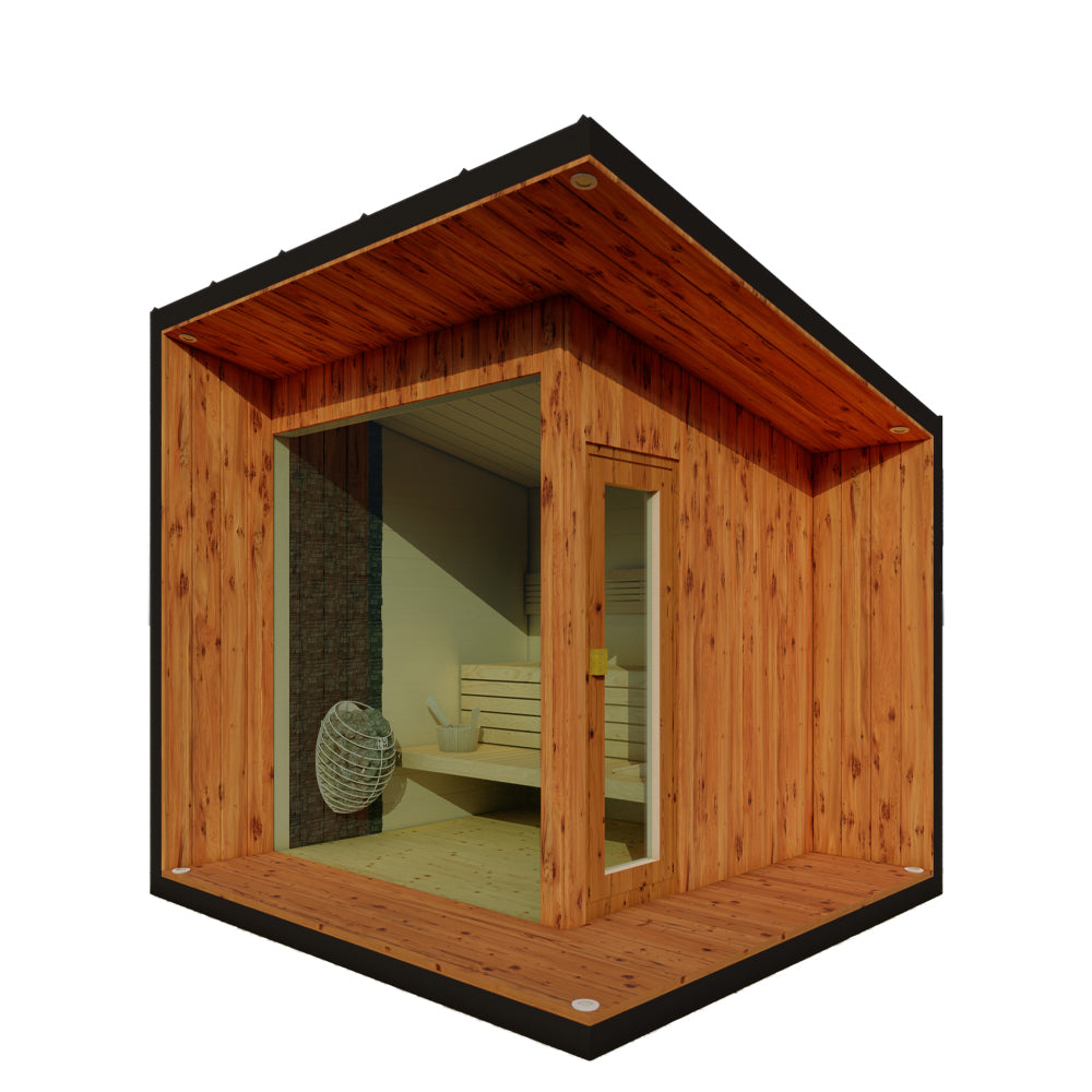 Ein besonderes Highlight der Gartensauna Liv ist das große Aluminiumfenster, das sich über die gesamte Breite der Sauna erstreckt. Mit gehärtetem Glas ausgestattet ermöglicht es einen weiten Blick ins Grüne und schafft eine offene und einladende Atmosphäre im Saunaraum. Der Holzfußboden und die Wandverkleidung aus skandinavischem Fichtenholz vervollständigen das natürliche und hochwertige Erscheinungsbild der Sauna.