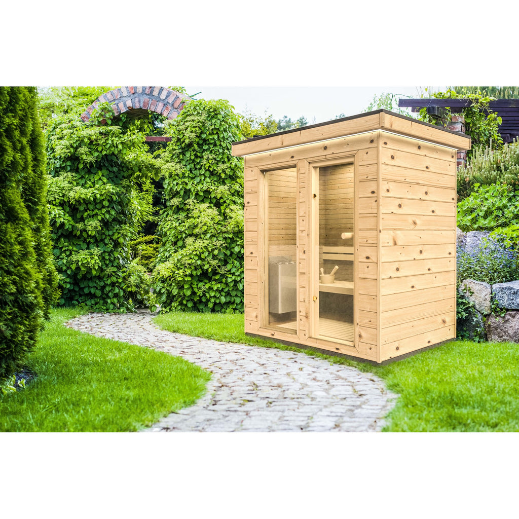 Die Mia-Gartensauna bietet ein harmonisches Zusammenspiel von hochwertigem Design und Funktionalität. Mit einer durchdachten Konstruktion und stilvollen Details schafft sie eine einladende Atmosphäre für entspannende Saunamomente im eigenen Garten.