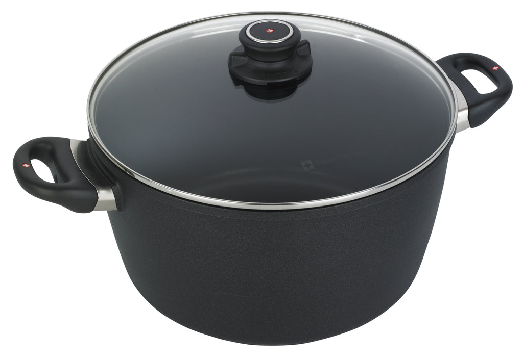 Mit einem Fassungsvermögen von 8,1l ist dieser Induktionstopf für das langsame und schonende Garen von Eintöpfen und Chilis sowie Suppen und Brühen konzipiert. Dieser Kochtopf ist jetzt mit der neuen diamantverstärkten Formel XD von Swiss Diamonds beschichtet. Diese Formel ist unsere neueste und fortschrittlichste diamantverstärkte Antihaft-Kochgeschirrlinie. Das Ergebnis ist eine deutlich härtere Kochfläche mit noch besseren Antihafteigenschaften.Sie müssen diesen Topf nicht mehr einweichen, nachdem Sie Ihr berühmtes Chili stundenlang gekocht haben. Einfach mit heissem Wasser und einem Seifenschwamm waschen und Ihre Pfanne ist wieder in gutem Zustand. Ausserdem ist diese Pfanne für einen gesunden Komfort ausgelegt. Swiss Diamonds neue XD Beschichtung ist PFOA-frei und ermöglicht es Ihnen, ohne Öl zu kochen, ideal für Jahre gesünderer Mahlzeiten. Dieser grossformatige Topf wird sich als praktisch erweisen, wenn Sie Nudeln kochen, einen Braten schmoren, die hausgemachte Tomatensauce herstellen, für die Sie berühmt sind, und vieles mehr zubereiten wollen. Zusätzlich ist der Deckel aus gehärtetem Glas gefertigt und verfügt über einen Knopf mit einstellbarem Dampfauslass. Mit einem Durchmesser von 28cm und einem Fassungsvermögen von 8,1 Liter passt dieser Topf problemlos auf fast alle Induktionsherdplatten und wird in den kommenden Jahren Ihr Favorit sein!Merkmale:Hergestellt mit einer Aluminiumbasis.20% mehr echte Diamantkristalle in der Beschichtung.Die Antihaftbeschichtung sorgt für gesundes Kochen.Der robuste Sockel verhindert das Verziehen, Kippen oder Drehen.Erhöhte Lebenserwartung durch Antihaftbeschichtung im Vergleich zu anderen Kochgeschirrserien.Kochen Sie bei niedriger bis mittlerer Hitze, um aussergewöhnliche Ergebnisse zu erzielen.Es ist nicht notwendig, mit Öl zu kochen.Gleichmässige Wärmeverteilung.Energieeffizient.Überlegene Haltbarkeit.Überlegene Freisetzung von Lebensmitteln.Geeignet für Gas-, Elektro-, Strahlungs-, Keramik-, Halogen- und Induktionskochfelder.Ofensicher bis 260° C (500°F)Geschirrspülmaschinenfest; von Hand abwaschen empfohlen.Hergestellt in der Schweiz.