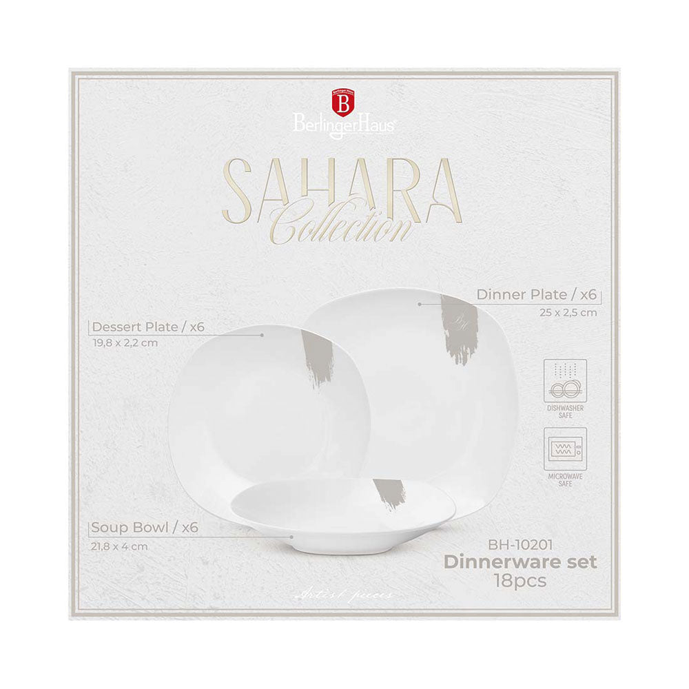 Das 18-teilige Tellerset Sahara Collection von Berlinger Haus vereint Stil und Funktionalität in einem. Hergestellt aus hochwertigem Porzellan, bringt es Eleganz auf deinen Tisch. Die edle Optik der Teller passt zu jeder Gelegenheit und macht deine Mahlzeiten zu einem besonderen Erlebnis. Das Set ist nicht nur spülmaschinenfest, sondern auch mikrowellengeeignet, was dir im Alltag viel Komfort bietet. Egal, ob für den täglichen Gebrauch oder besondere Anlässe, mit diesem Tellerset setzt du immer auf Qualität und zeitlose Schönheit., , , Produktinformation, , Porzellan von erstklassiger Qualität, Elegantes Design, Ist spülmaschinengeeignet, Mikrowellengeeignet, , Lieferumfang, , 6x Essteller: 24,7 x 25 cm, 6x Suppenteller: 21,7 x 21,8 cm, 6x Dessertteller: 19,5 x 19,8 cm