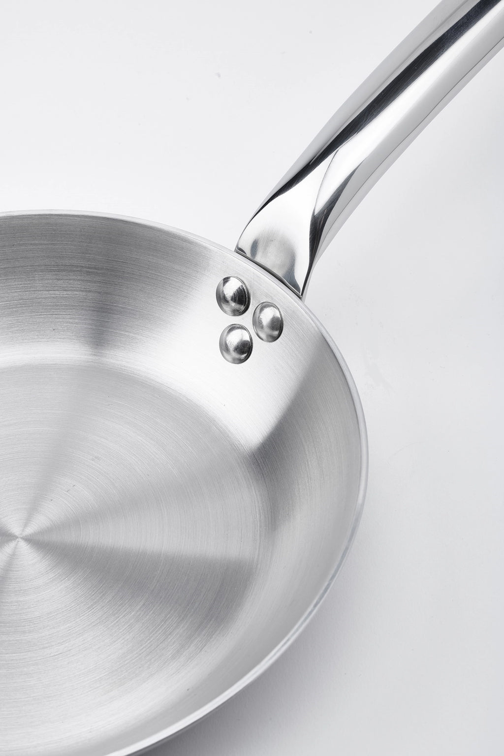 Runde Edelstahl Bratpfanne mit in Lyonnaise-Form. Das Bratgut gleitet aus der Pfanne. Ideal zum Anbraten, Grillen, Bräunen, Flambieren. Elegant in der Küche, auf dem Büffet und auf dem Tisch. Auf allen Herdarten einsetzbar - inkl. Induktion.
