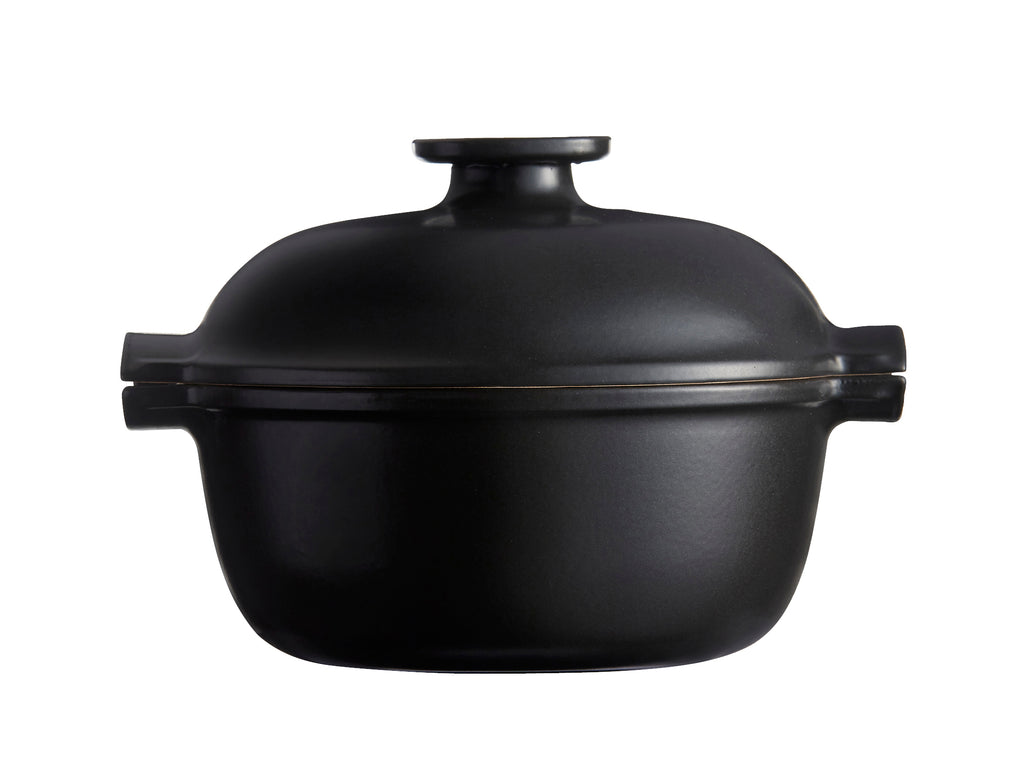 Der Schmortopf “Delight”, die auf einem technologischen Spitzenrezept basiert, ist sehr leicht und für alle Herdarten (einschliesslich Induktion) sowie für den Backofen geeignet. Sie bietet die Vorteile einer gesunden Zubereitung, bei der die Nährstoffe der Zutaten erhalten bleiben. Die gleichmässige Wärmeverteilung in der Keramik ist ideal, um den Geschmack auf kleiner Flamme zu entfalten und sanft zu kandieren, ohne zu verbrennen… Die Spitzen unter dem Deckel fangen die verdampften Säfte ein, die in einem feinen Regen auf die Zubereitung fallen und diese während des Kochens kontinuierlich begiessen, für ein weiches und aromatisch konzentriertes Ergebnis. Mit ihren grosszügigen Kurven und der mattschwarzen, schlichten Oberfläche eignet sich die Schmorpfanne “Delight” hervorragend für Familienrezepte und exotische Gerichte. Ihre Keramik mit ihrer natürlichen Antihaftwirkung ist pflegeleicht und direkt spülmaschinenfest. Die Fertigung ist bis zu einer Temperatur von 290°C hitzebeständig.Ein schickes und zeitloses Design: Für Delight hat Véronique Maire das Design der Schmorpfanne neu erfunden, das von den japanischen Formen inspiriert ist, um in einer modernen Welt, die nach Einfachheit strebt, die Rezepte von früher oder von anderswo fortzuführen, und sie am Tisch zu teilen. Sie wird in den Werkstätten von Emile Henry im Burgund handgefertigt und kontrolliert, und hat eine Garantie von 5 Jahren.