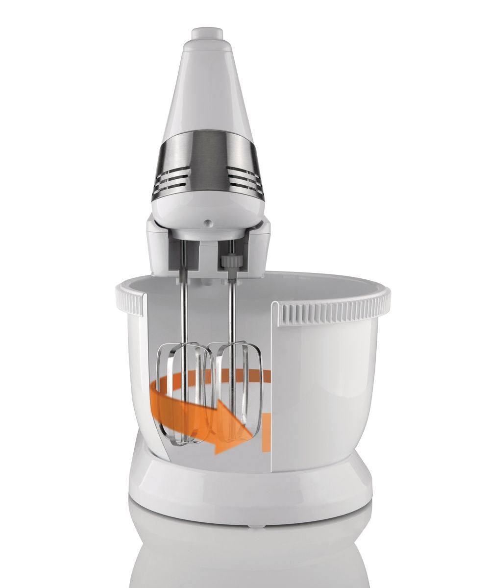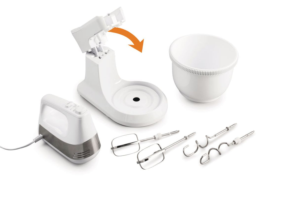 Handmixer mit Gerästeständer:Handmixer mit praktischem Geräteständer und RührschüsselRührschüssel mit 3L FassungsvermögenAutomatisch rotierende Rührschüssel für optimale Mixergebnisse5 Geschwindigkeitsstufen & Turbo-FunktionQuirle und Knethaken aus hochwertigem EdelstahlAuswurftaste für Aufsätzespülmaschinengeeignete Rühraufsätze