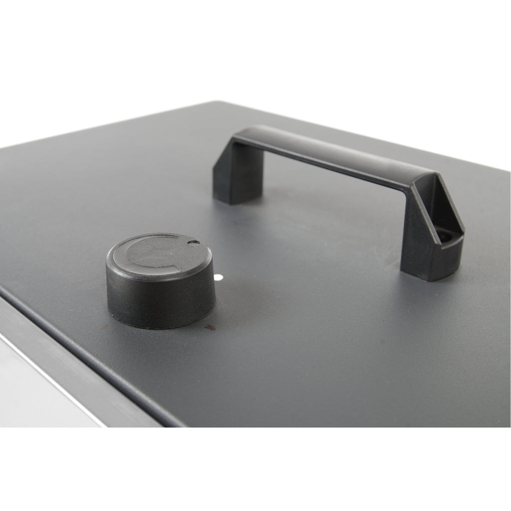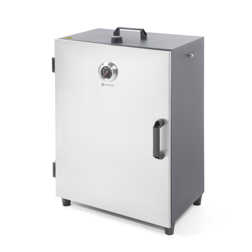 Aus Edelstahl, mit einer magnetisch schließenden, doppelt isolierten Tür. Temperatur einstellbar mit einem Thermostat, Thermometer in der Tür integriert. Ausgestattet mit einem Heißluftauslass auf der Rückseite. Lieferung mit 3 Gittern (400x279mm) und 3 Fleischhaken.
