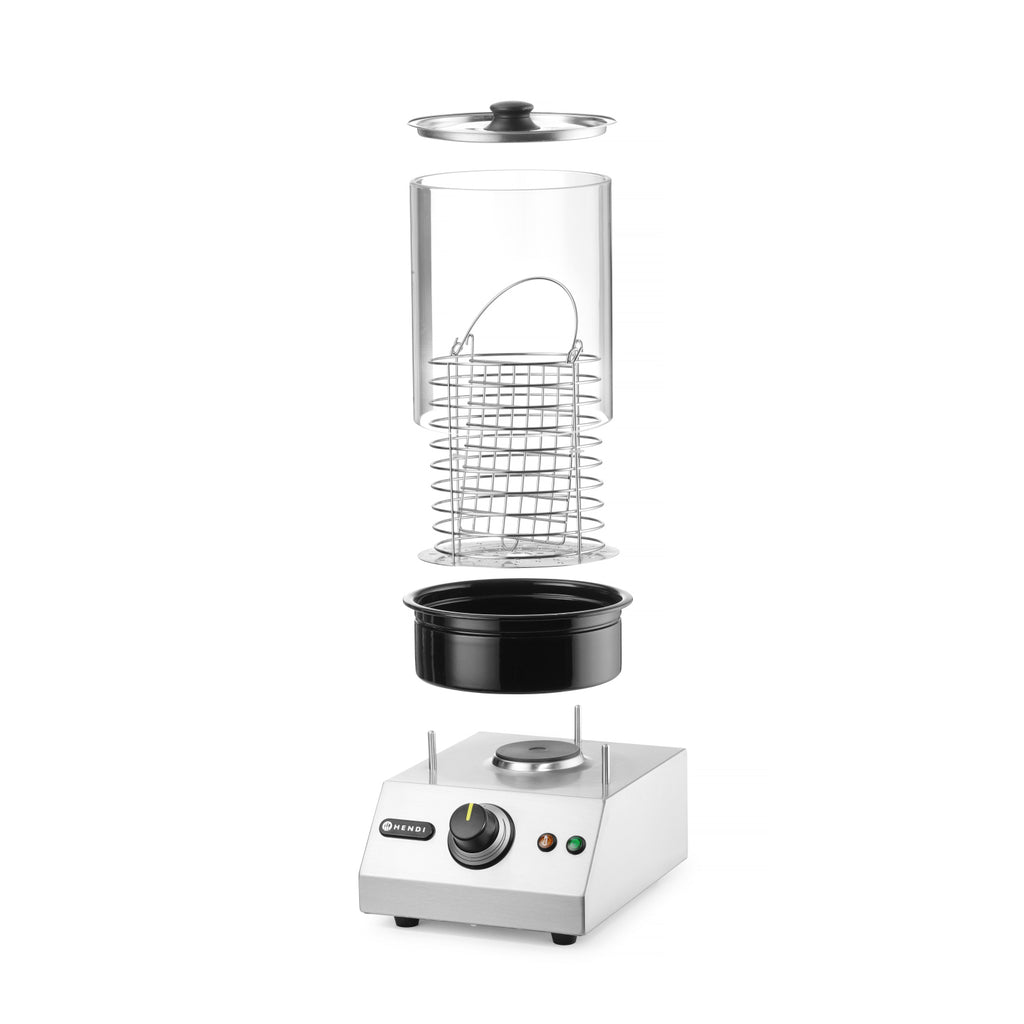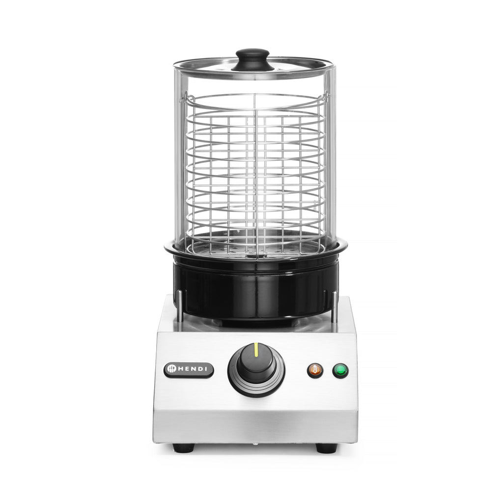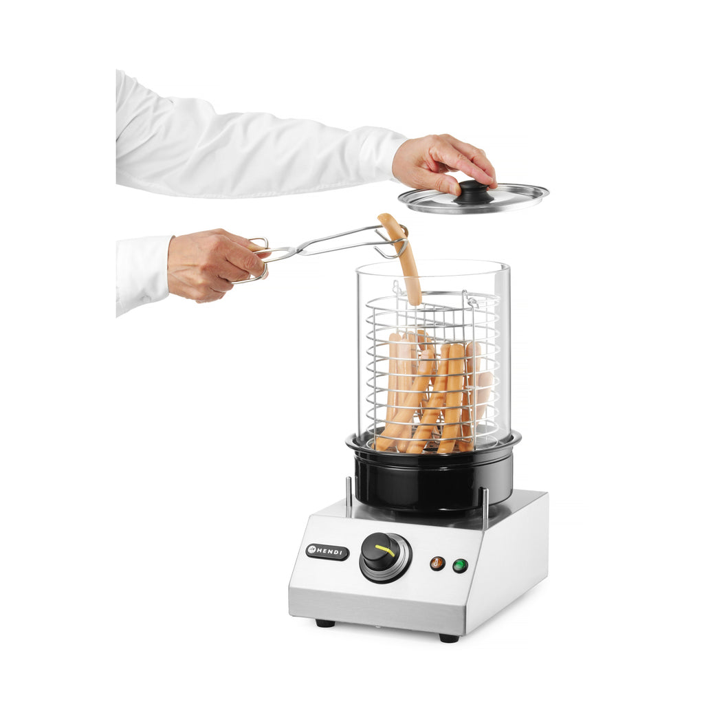 Für einfaches Aufwärmen und Warmhalten von HotDog-Würstchen, Edelstahlgehäuse, Würstchenbehälter aus Glas, verstärkt mit eloxiertem Aluminium. Leistung stufenlos regelbar.