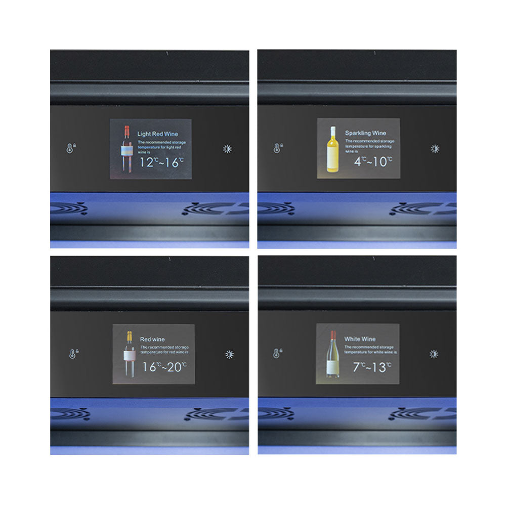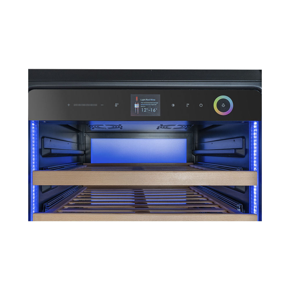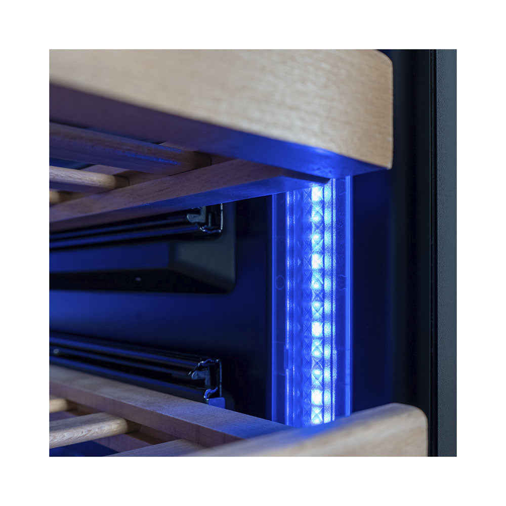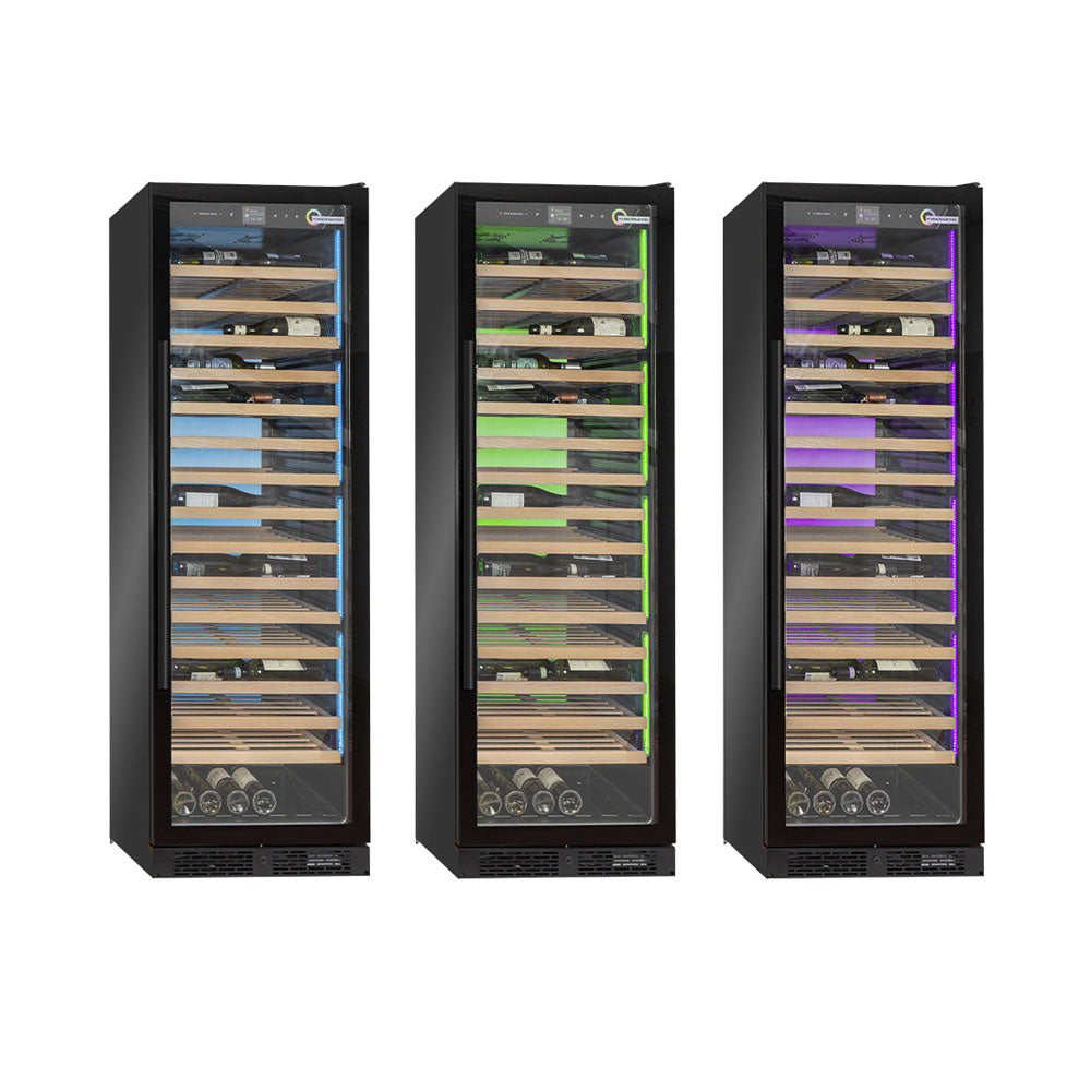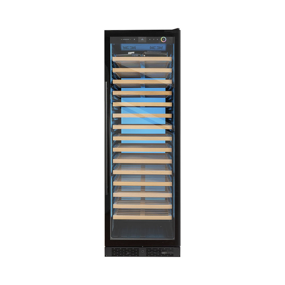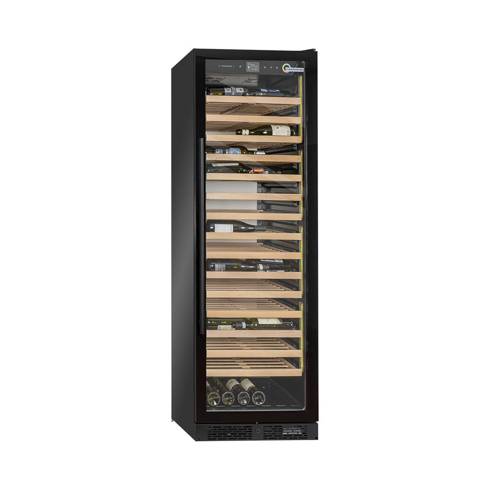 Der freistehende Klimaschrank überzeugt mit modernem Design und hoher Kapazität. Mit einem Fassungsvermögen von bis zu 146 Flaschen (75 cl) bietet er optimale Lagerbedingungen für wertvolle Weinsammlungen. Der Temperaturbereich von 4 bis 20 °C ermöglicht eine präzise Klimakontrolle, während das umweltfreundliche Kältemittel R600a für effiziente Kühlung sorgt. Die hochwertige schwarze Optik und die LED-Innenbeleuchtung verleihen dem Gerät eine elegante Ausstrahlung., Ausgestattet mit 15 stabilen Regalen aus Holz, gewährleistet der Schrank eine sichere und übersichtliche Aufbewahrung. Der geringe Geräuschpegel von nur 39 dB(A) sorgt für einen ruhigen Betrieb, ideal für Wohnräume oder Restaurants. Mit einem Energieverbrauch von 180 kWh pro Jahr und einer Leistung von 270 W kombiniert das Gerät Effizienz mit hoher Leistung. Die langlebige Konstruktion ist perfekt für anspruchsvolle Weinliebhaber.