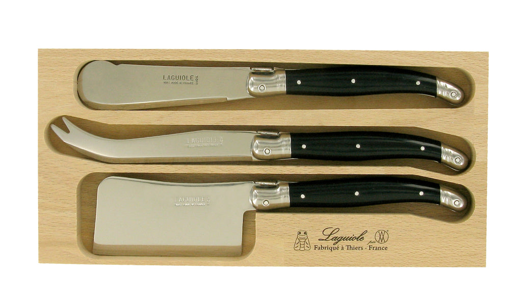 Das 3-teilige Laguiole Käse-Set von André Verdier besteht aus einem Sandwich-Messer, einem Käsemesser GG und einem Käse-Hackmesser aus der DEBUTANT ABS Serie sowie der dazugehörigen Schachtel. Es handelt sich um Laguiole-Messer mit durchgehendem Erl (Vollerl), mit einer Klinge aus gehärtetem X46Cr13 Edelstahl und einer Dicke von 1,2 mm. Sie haben einen ABS-Griff, Kröpfe aus Edelstahl, und verfügen über eine «Spiegel»-Verarbeitung. Die Messer werden mit 5 Nieten zusammengefügt.Sie werden zu 100 % in Frankreich, in Thiers, hergestellt.