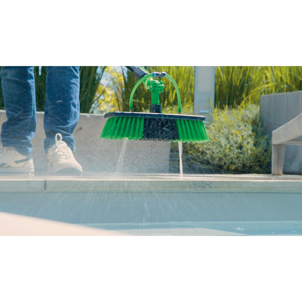 Der Aquaclean Deluxe lässt sich mühelos an den Gartenschlauch anschließen, um eine optimale Reinigung zu ermöglichen. Mit dem integrierten Durchlauf-System wird das Wasser bis an die Spitze der Borsten oder des Fensterreinigers transportiert, um auch hartnäckige Verschmutzungen zu lösen.