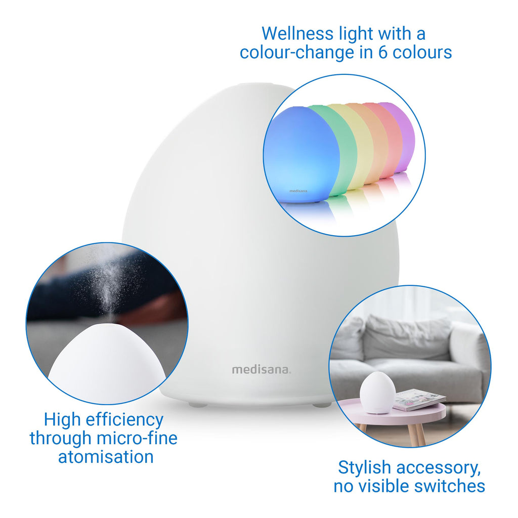 Dank seiner modernen Ultraschall-Technologie erzeugt der Aroma-Diffusor AD 635 einen feinen Nebel, über den die wohltuenden Düfte gleichmässig und dezent im gesamten Raum verteilt werden. Ob ausgleichend und beruhigend oder anregend und vitalisierend – bei der Wahl der für den Anlass passenden Düfte sind der eigenen Phantasie keine Grenzen gesetzt. Durch die mikrofeine Zerstäubung besitzt der AD 635 für Duftöle eine hohe Wirksamkeit. Er ist zudem geräuscharm und energiesparend und schaltet sich bei leerem Tank automatisch ab. Der Medisana Aroma Diffusor AD 635 ist ein dekorativer Blickfang in jedem Wohnambiente. Er überzeugt besonders durch sein schlichtes und modernes Design und ist ein stilvolles Accessoire ohne sichtbare Bedienelemente. In Verbindung mit dem sanft wechselnden Wellness-Licht in sechs Farben entsteht eine ganz individuelle Wohlfühl-Atmosphäre in den eigenen vier Wänden – die Basis für mehr Lebensqualität und Gesundheit.