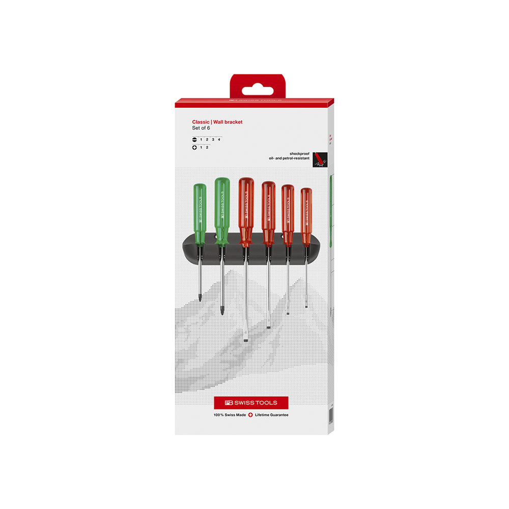 Das Schraubenzieher Set PB 245 CBB Classic mit Wandhalterung ist für den Einsatz bei höchsten Ansprüchen, präzise, massgenaue Spitzen und mit optimalem Sitz in den Schrauben. Mit den unterschiedlichen Grössen für Schlitz-Schrauben 1, 2, 3, 4 und Pozidriv-Schrauben 1, 2 ist das Set vielseitig einsetzbar., , , Produktinformation, , Für Schlitz-Schrauben 1, 2, 3, 4 und Pozidriv-Schrauben 1, 2, Speziallegierung auf Basis von Federstahl, Hohe Elastizität bei hoher Härte, Hochwertige Materialauswahl, Öl- und benzinbeständig, Schlagfest