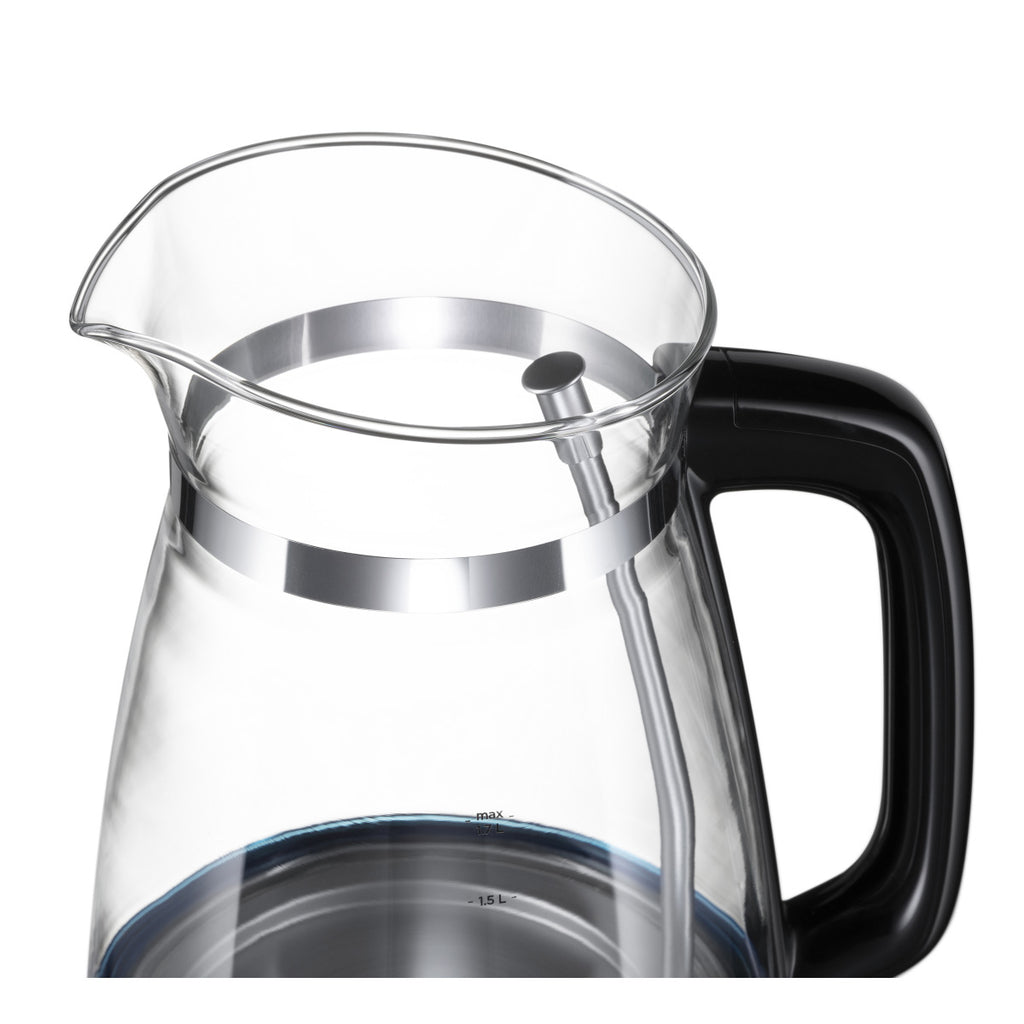 Der Classic Glass Wasserkocher von Russell Hobbs kombiniert moderne Glasbearbeitung mit einem künstlerisch inspirierten Look. Das Design im Stil einer Karaffe folgt dem Trend zu handgefertigten Produkten. Dank der Schnellkochfunktion bringt der Glas-Wasserkocher eine Tasse Wasser in 55 Sekunden zum Kochen und spart dabei ausserdem bis zu 66 % Energie ein. Dabei fasst das Gerät 1.7 l und bietet somit Platz für 7 Tassen. Während des Kochens erstrahlt der Wasserkocher in blauem Licht. Dank der Perfect-Pour-Ausgusstülle geht beim Ausgiessen kein Tropfen mehr daneben. Für zusätzlichen Komfort sorgt der 360°-Sockel, sodass sowohl Rechts- als auch Linkshänder den Wasserkocher aus hochwertigem Glas und langlebigem Kunststoff bequem bedienen können.