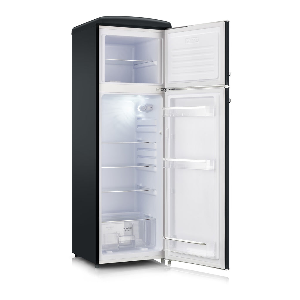 Mit vier höhenverstellbaren Abstellflächen aus Sicherheitsglas, drei Türfächern und verstellbaren Füßen bietet die RKG8984 maximale Flexibilität bei der Nutzung und Organisation Ihrer Lebensmittel. Genießen Sie stilvolles Design und moderne Funktionalität mit der Retro Kühl- / Gefrierkombination RKG8984 von Severin.