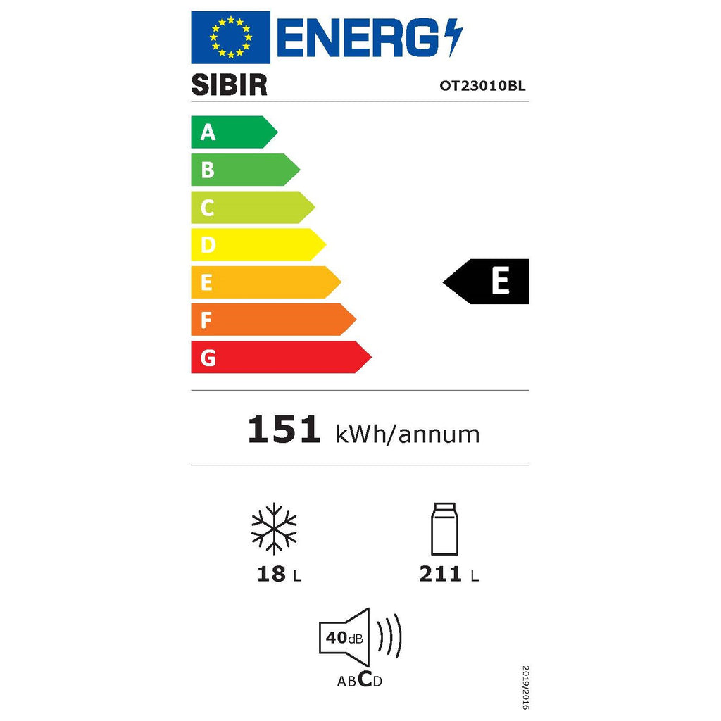 Der Kühlschrank mit Gefrierfach OT23010BL von Sibir bietet eine großzügige Aufbewahrungslösung für Ihre Lebensmittel, kombiniert mit einer effizienten Energieleistung.