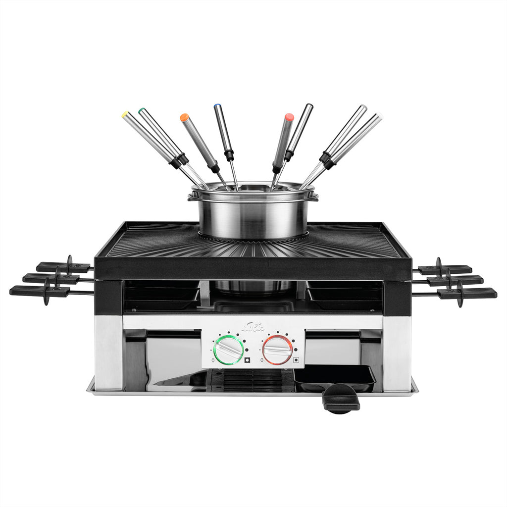 Der Solis Combi Grill 3 in 1 ist ein vielseitiges Gerät mit einem attraktiven Design, das in einem stimmungsvollen Ambiente sicher nicht fehl am Platz wirkt. Ob Sie ein leckeres Schokoladenfondue oder ein herzhaftes Fleischfondue bevorzugen, feinster Raclette-Käse schmelzen lassen wollen, oder lieber gegrilltes Fleisch, Fisch und Gemüse geniessen: Dieser effiziente Grill bietet alle Möglichkeiten gleichzeitig!