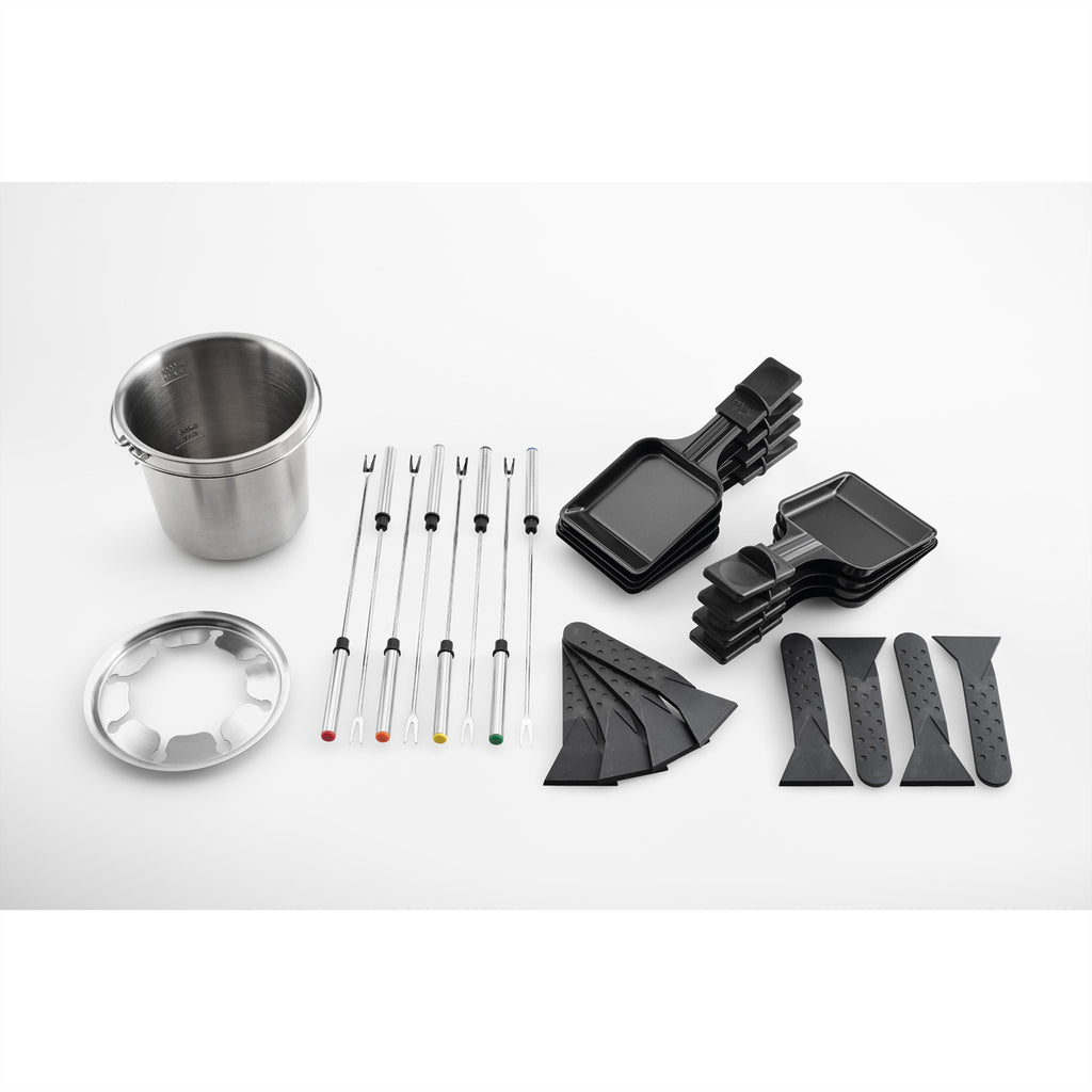 Der Edelstahl-Fonduetopf hat ein grosszügiges Fassungsvermögen von 1,3 Litern und verfügt über einen Spritzschutz sowie ausklappbare Griffe zum sicheren Einsetzen und Entnehmen des Topfes. Mit einer Leistung von 800 Watt wird Ihre Schokolade oder Ihre Bouillon im Handumdrehen und auf die gewünschte Temperatur erhitzt. Die Gabeln haben wärmeisolierende Griffe für einen angenehmen Halt. Diese wärmeisolierenden Griffe finden Sie auch bei den ebenfalls mitgelieferten 8 quadratischen Raclette-Pfännchen.