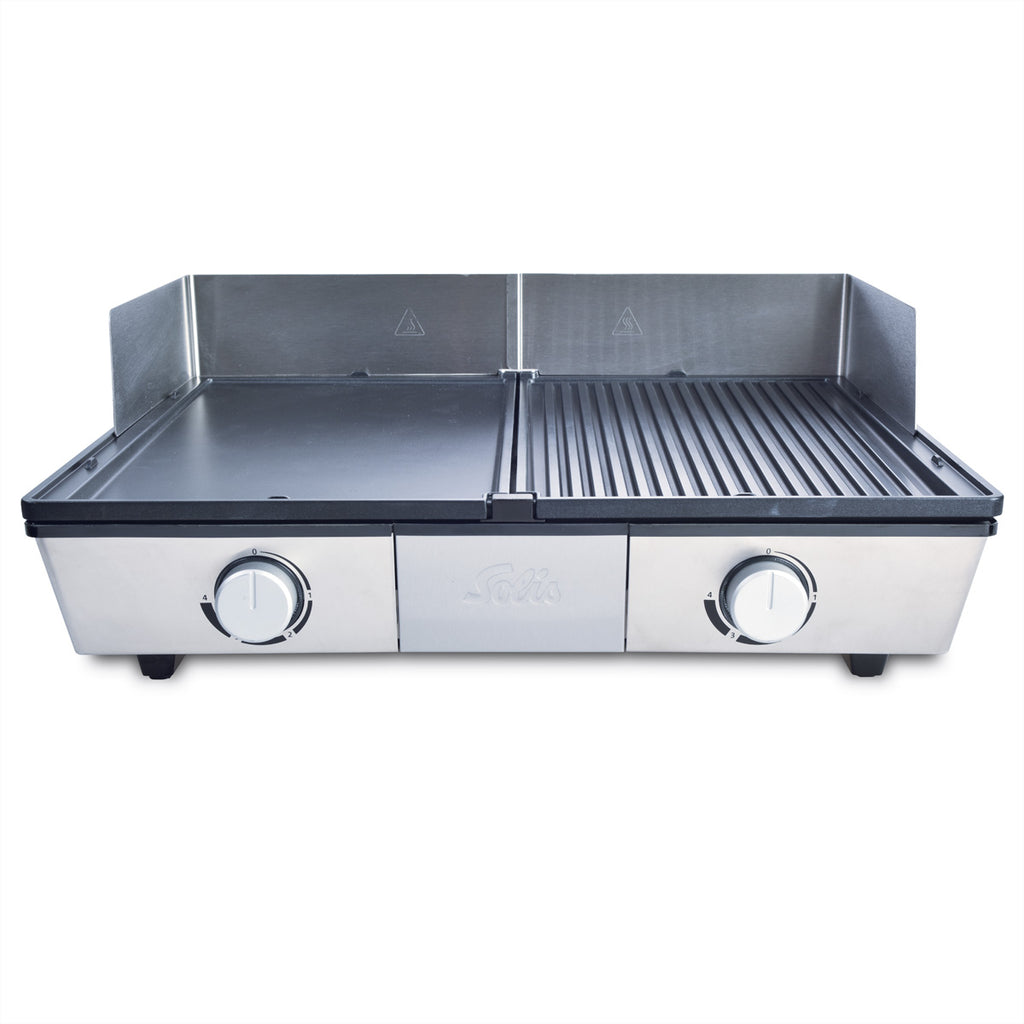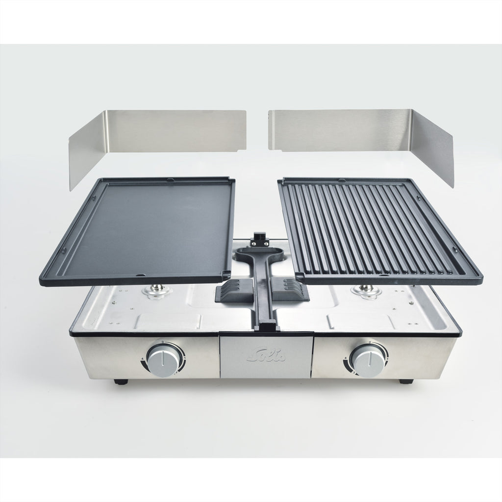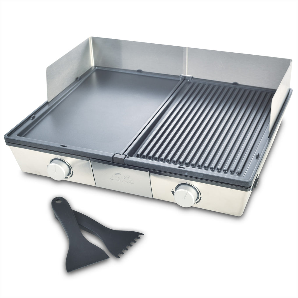 Kompakt, unkompliziert und sauber - Der kleine Solis Deli Elektrogrill ist ideal für spontanen Grillspass draussen auf der Veranda oder in der Küche. Setzen Sie die Grillplatten ein, stecken Sie den Stecker in die Steckdose, schalten Sie den Grill ein, lassen Sie ihn aufheizen und los geht's. Die Temperatur der beiden Grillplatten kann stufenlos und getrennt voneinander eingestellt werden, so dass alle Arten von Grillgut von Fleisch bis hin Gemüse optimal zubereitet werden können. Mit den mitgelieferten Wendern umdrehen und fertig. Der abnehmbare Spritzschutz schützt die Umgebung vor Fettspritzern. Ausserdem kommt es beim Grillen mit dem Elektrogrill zu keinen störenden Rauch- oder Geruchsentwicklungen.