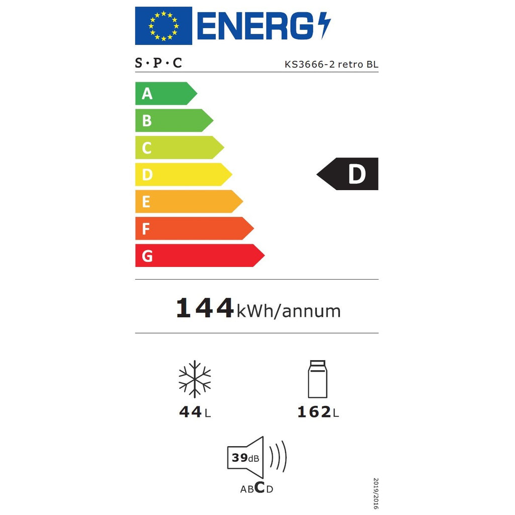 Der Kühlschrank hat eine Klimaklasse von N und ST, was bedeutet, dass er in Umgebungstemperaturen von 16°C bis 38°C optimal funktioniert. Das Gerät hat die Energieeffizienzklasse D, was in der neuen Skala heisst, dass der Kühlschrank aktuell eines der energieeffizientesten Modelle auf dem Markt zählt und weniger Strom verbraucht als Geräte mit schlechterer Energieeffizienz.