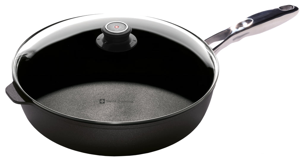 Die Induktions-Sautépfanne 32cm (5.5L) von Swiss Diamond ist das ultimative Arbeitstier für die Küche. Dieses vielseitige Gerät ist geräumig genug, um Ihre gesamte Mahlzeit in einer Pfanne zuzubereiten! Braten Sie Ihr Lieblingsfleisch an, geben Sie etwas Gemüse dazu und stellen Sie die Pfanne direkt in den Ofen, da alle Swiss Diamond Produkte bis 260°C ofenfest sind. Diese Top-Pfanne ist jetzt mit Swiss Diamond XD ausgestattet, unserer neuesten, fortschrittlichsten, diamantverstärkten Antihaft-Kochgeschirrlinie. Die PFOA-freie XD-Formel wird in unserem Labor in der Schweiz entwickelt und mit einem umweltfreundlichen, fortschrittlichen Produktionsprozess hergestellt. Das Ergebnis ist eine wesentlich härtere Kochoberfläche mit noch besseren Trenneigenschaften für Lebensmittel.Verwenden Sie den wärmegehärteten Glasdeckel, um den Geschmack beim Kochen der Zutaten ziehen zu lassen. Er verfügt über einen Drehknopf mit einem einstellbaren Dampfventil, das Ihnen eine hervorragende Feuchtigkeitskontrolle ermöglicht. Der ergonomische Griff aus Edelstahl ist ohne Nieten sicher befestigt und für maximale Stabilität und Manövrierfähigkeit in der Küche ausgelegt. Die neue XD-Beschichtung sorgt für jahrelanges qualitativ hochwertiges, problemloses Kochen. Es gibt nicht nur 20 Prozent mehr Diamanten als zuvor, sondern die Abdichtung zwischen der Kochfläche und dem Aluminiumboden wird verbessert, wodurch eine korrosionsbeständigere Schicht entsteht. Möchten Sie gesündere Mahlzeiten für sich und Ihre Familie kochen? Die XD-Beschichtung ist so konzipiert, dass sie ohne Öl oder Butter verwendet werden kann und bei jedem Gericht, das Sie zubereiten, überschüssige Kalorien entfernt. Diese große Sauteuse ist die einzige Sauteuse, die Sie jemals brauchen oder benutzen wollen!Merkmale:Hergestellt mit einer Aluminiumbasis20% mehr echte Diamantkristalle in der BeschichtungDie Antihaftbeschichtung sorgt für gesundes KochenDer robuste Sockel verhindert das Verziehen, Kippen oder DrehenErhöhte Lebenserwartung durch Antihaftbeschichtung im Vergleich zu anderen KochgeschirrserienKochen Sie bei niedriger bis mittlerer Hitze, um aussergewöhnliche Ergebnisse zu erzielenEs ist nicht notwendig, mit Öl zu kochenGleichmässige WärmeverteilungEnergieeffizientÜberlegene HaltbarkeitÜberlegene Freisetzung von LebensmittelnGeeignet für Gas-, Elektro-, Strahlungs-, Keramik-, Halogen- und InduktionskochfelderOfensicher bis 260°C (500°F)Geschirrspülmaschinenfest; von Hand abwaschen empfohlenHergestellt in der Schweiz
