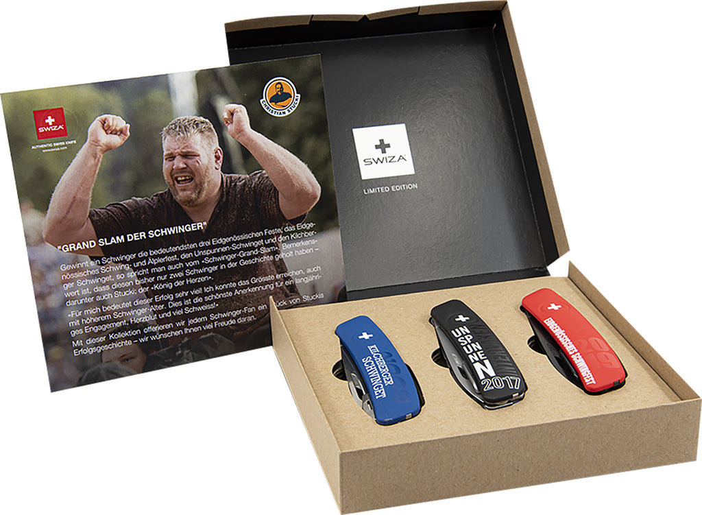 SWIZA-Messer in Kürze:Die Messerherstellung ist zusammen mit einer langjährigen Uhrmachertradition im Schweizer Jura verankert. SWIZA-Messer werden nach den höchsten Schweizer Qualitätsstandards hergestellt.Schwinger Spirit: Das Vermächtnis von Christian Stucki im Schweizer Schwingsport ist eine starke Geschichte von Stärke, Ausdauer und Leidenschaft für die Tradition. Während seiner glanzvollen Karriere hat er den Geist des Schwingens zum Leben erweckt und wurde zu einer Ikone im und ausserhalb des Rings.3 AUSFÜHRUNGEN: WM01 R + TT04 ALLMATT + D03 ALLBLACK