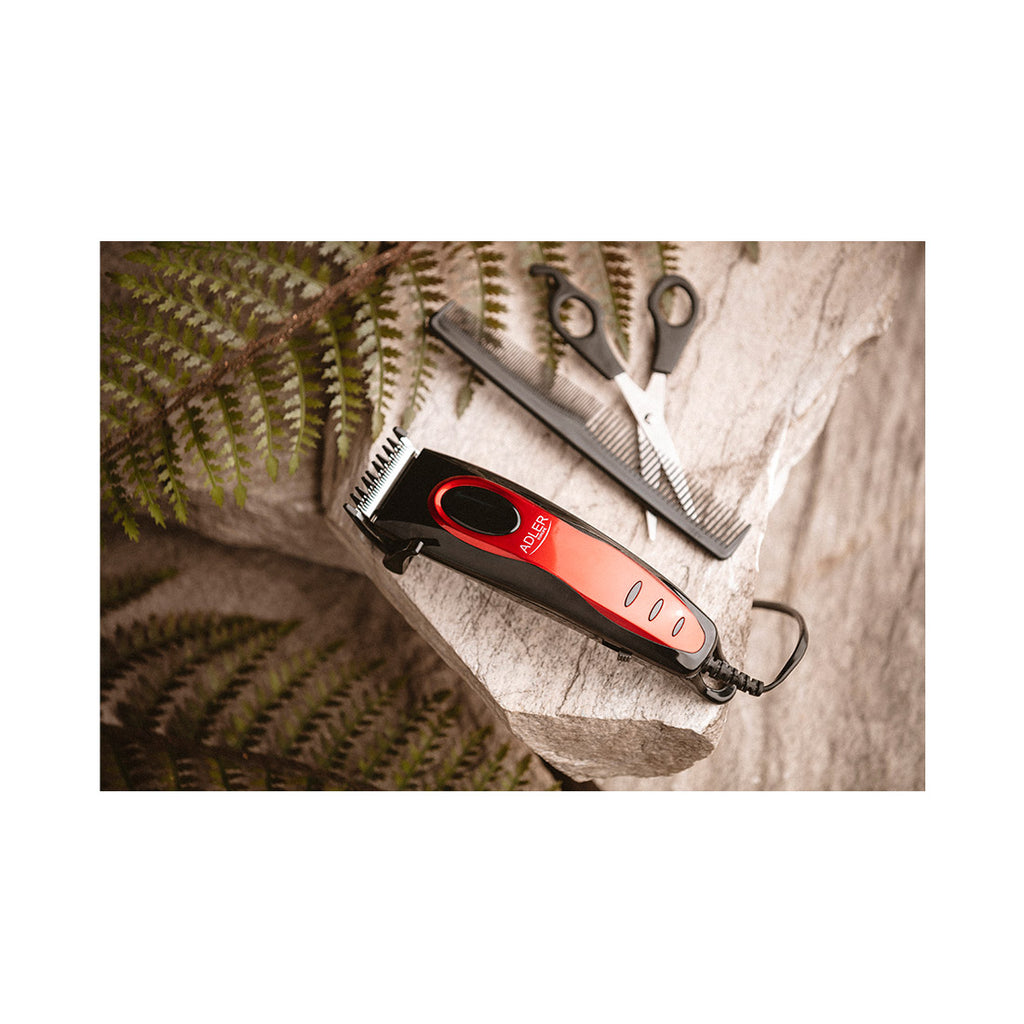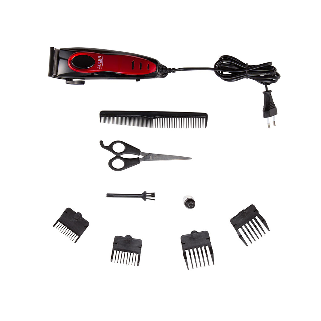 Produktinformation:, 4 austauschbare Kämme: 3,6,9 und 12 m, Langlebige und scharfe Klinge aus rostfreiem Stahl mit 45 mm Breite, Geräuscharmer Motor, Sanfte Schnittlängenregulierung, Ergonomisches Gehäuse, Langes, professionelles 1,9 m langes Kabel, Leicht zu reinigen, Set enthält: Bürste, Schere und Pflegeöl, Aufhängehaken