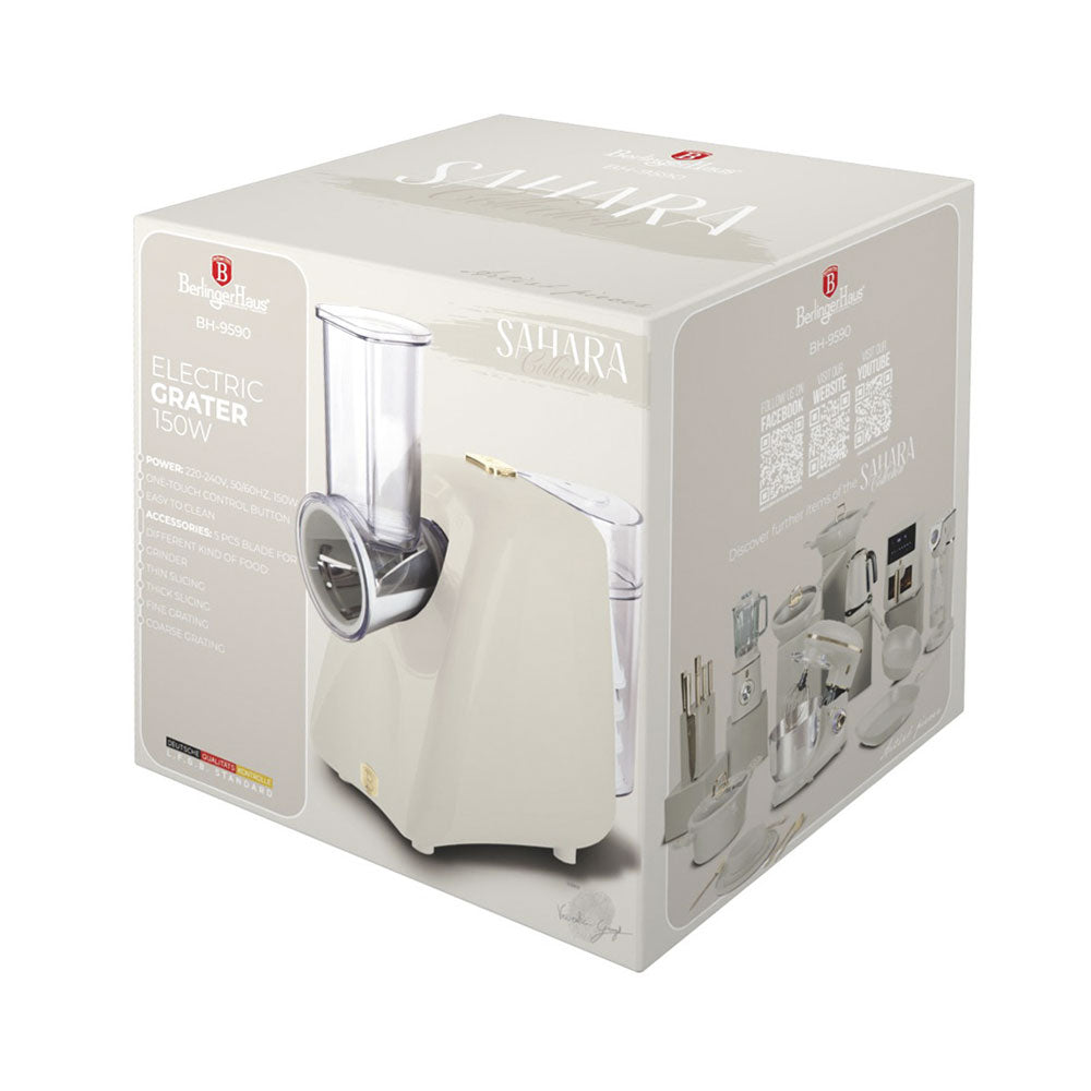Mit dem elektrischen Salatzubereiter von Berlinger Haus bereitest du mühelos frische und gesunde Gerichte zu. Dank des leistungsstarken 150-W-Motors kannst du Gemüse, Obst, Käse und sogar Schokolade schnell und präzise schneiden oder raspeln. Die fünf vielseitigen Aufsätze bieten dir zahlreiche Möglichkeiten: grobes oder feines Raspeln, dicke oder dünne Scheiben und Reiben – ideal für Salate, Pfannengerichte oder Garnierungen. Die One-Touch-Bedienung sorgt für eine einfache Handhabung, während der ergonomische Griff dir eine sichere Nutzung ermöglicht. Nach der Zubereitung ist die Reinigung kinderleicht: Alle abnehmbaren Teile sind spülmaschinenfest. Dank des kompakten Designs lässt sich der Salatzubereiter platzsparend verstauen. Ob für schnelle Snacks oder aufwendige Rezepte – mit dem Gemüseschneider Sahara gelingt dir die Essenszubereitung im Handumdrehen., , , Produktinformationen, , 5 vielseitige Aufsätze, Benutzerfreundliches Design, Leicht zu reinigen, One-Touch-Bedienung für mühelose Handhabung, Ergonomischer Easy-Grip-Griff für sicheren Halt, Spülmaschinenfeste Komponenten, Leistung: 150 W-Motor , , Funktion der 5 Aufsätze:, , Grobes Raspeln: Ideal für Gemüse wie Karotten und Zucchini, Dünnes Raspeln: Perfekt für feinere Texturen wie Käse oder weicheres Gemüse, Dicke Scheiben: Ideal für Gurken, Kartoffeln und Obst, Dünnes Schneiden: Ideal für Garnituren und empfindliches Obst oder Gemüse, Reiben: Perfekt für Hartkäse, Nüsse und Schokolade