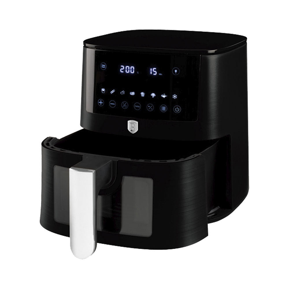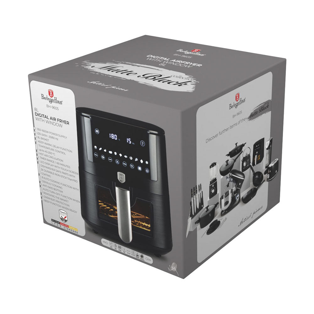 Die Berlinger Haus Heissluftfritteuse aus der Matte Black Collection revolutioniert dein Kochen! Mit einem Fassungsvermögen von 8 Litern und acht automatischen Kochfunktionen zauberst du im Handumdrehen gesunde Gerichte – ganz ohne Öl und Fett. Die mattschwarze Oberfläche verleiht deiner Küche einen edlen Touch. Und das Beste: Die Teile sind spülmaschinenfest und mit einer dreischichtigen Beschichtung versehen, was die Reinigung zum Kinderspiel macht. Hol dir diese Heissluftfritteuse und erlebe gesundes Kochen auf einem neuen Level!, , Produktinformation, , 8 Liter Antihaft-Lebensmittelkorb, Digital, Temperaturhalte- und Verzögerungsfunktion, Automatische Abschaltfunktion, wenn der Korb entfernt wird, Spülmaschinenfeste Teile mit dreischichtiger, langlebiger Antihaft-TitaniumPro-Oberfläche, 8 automatische Kochfunktionen mit Standardeinstellungen, Überhitzungsschutz, LED-Touchscreen-Anzeige, Mit Sichtfenster, Timer für bis zu 60 Min., Anti-Rutsch-Füsse, Gesundes Kochen ohne Öl und Fett