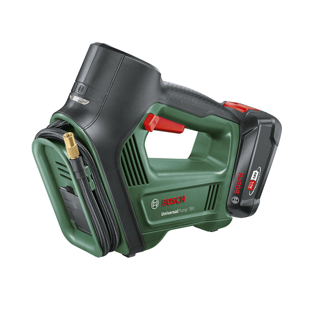 Die Bosch UniversalPump 18V ist die ideale Akku-Druckluftpumpe für unterwegs. Mit bis zu 10,3 bar (150 psi) und 30 l/min pumpst du Autoreifen, Fahrradreifen, Motorradreifen und Bälle schnell und mühelos auf. Dank der intuitiven Steuerung per Fingerdruck regulierst du den Druck präzise, während das beleuchtete Manometer dir jederzeit die Werte anzeigt. Der kompakte und handliche Aufbau sorgt für maximalen Komfort, und alle Adapter sind direkt am Gerät verstaut – so hast du sie immer griffbereit. Die integrierte Ventilbeleuchtung erleichtert das Arbeiten auch bei schlechten Lichtverhältnissen, und die Akkustatusanzeige zeigt dir den Ladezustand an. Mit dem 18V POWER FOR ALL Akku-System geniesst du volle Flexibilität ohne störende Kabel. Perfekt für unterwegs., , , Produktinformationen, , , Lieferumfang:, , 1 x Akku PBA 18V 2.0Ah, 1 x Ballnadel, 1 x französisches Ventil, 1 x Ladegerät AL 18V-20, 1 x Volumenadapter