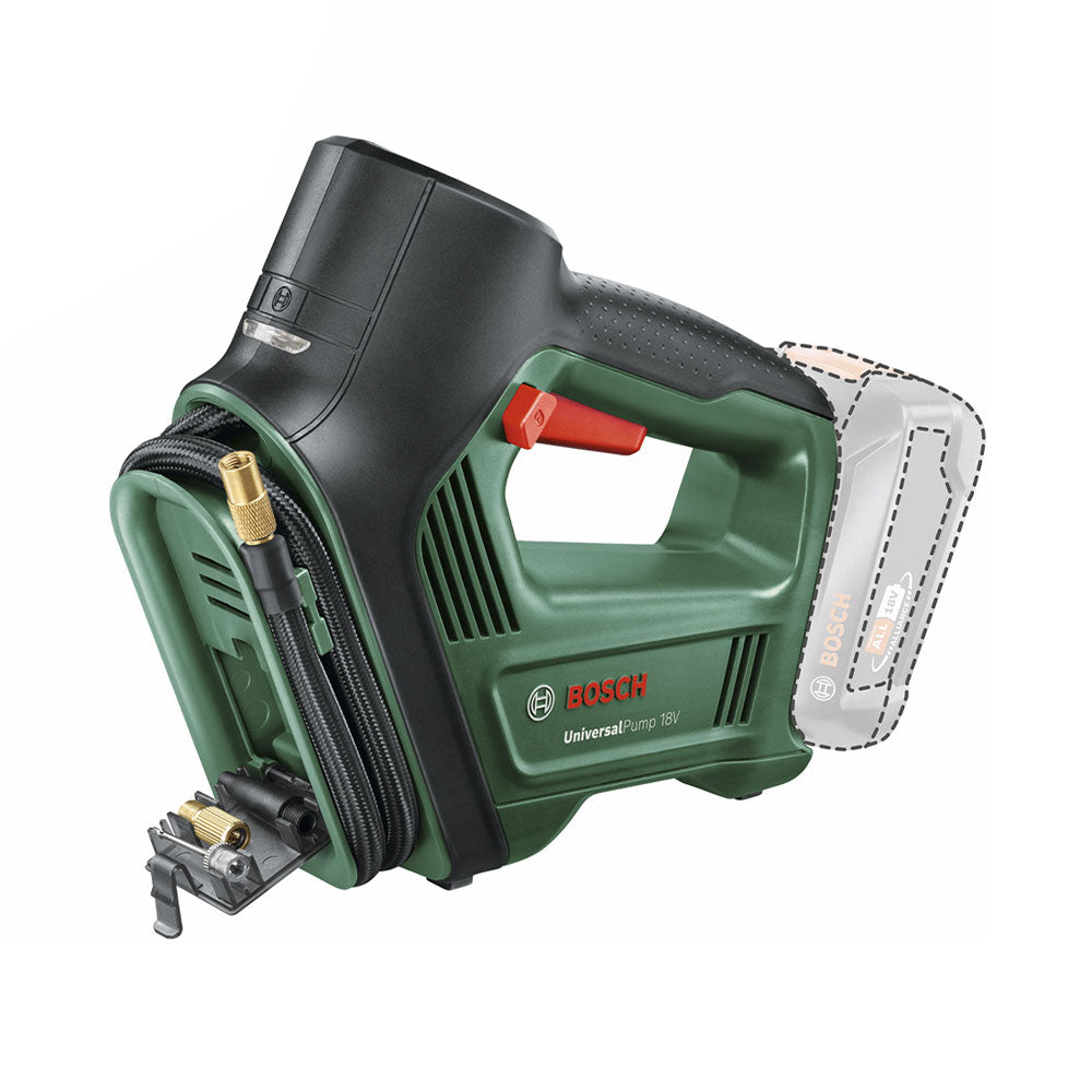 Die Bosch Akku-Druckluftpumpe 18V (0.603.947.100) ist dein zuverlässiger Helfer für unterwegs. Egal ob Autoreifen, Fahrradreifen, Bälle oder Luftmatratzen – mit bis zu 10,3 bar Druck füllst du alles schnell und mühelos auf. Dank des leistungsstarken 18V-Akkus arbeitest du kabellos und flexibel. Das digitale Display zeigt den aktuellen Druck präzise an, und die Abschaltautomatik sorgt für sicheres Aufpumpen. Mit dem LED-Licht bist du auch bei Dunkelheit bestens ausgestattet. Die handliche Bauweise und das umfassende Zubehör machen sie perfekt für Garage, Camping und unterwegs. Einfach aufladen und loslegen!, , Lieferumfang, , Französisches Ventil, Volumenadapter