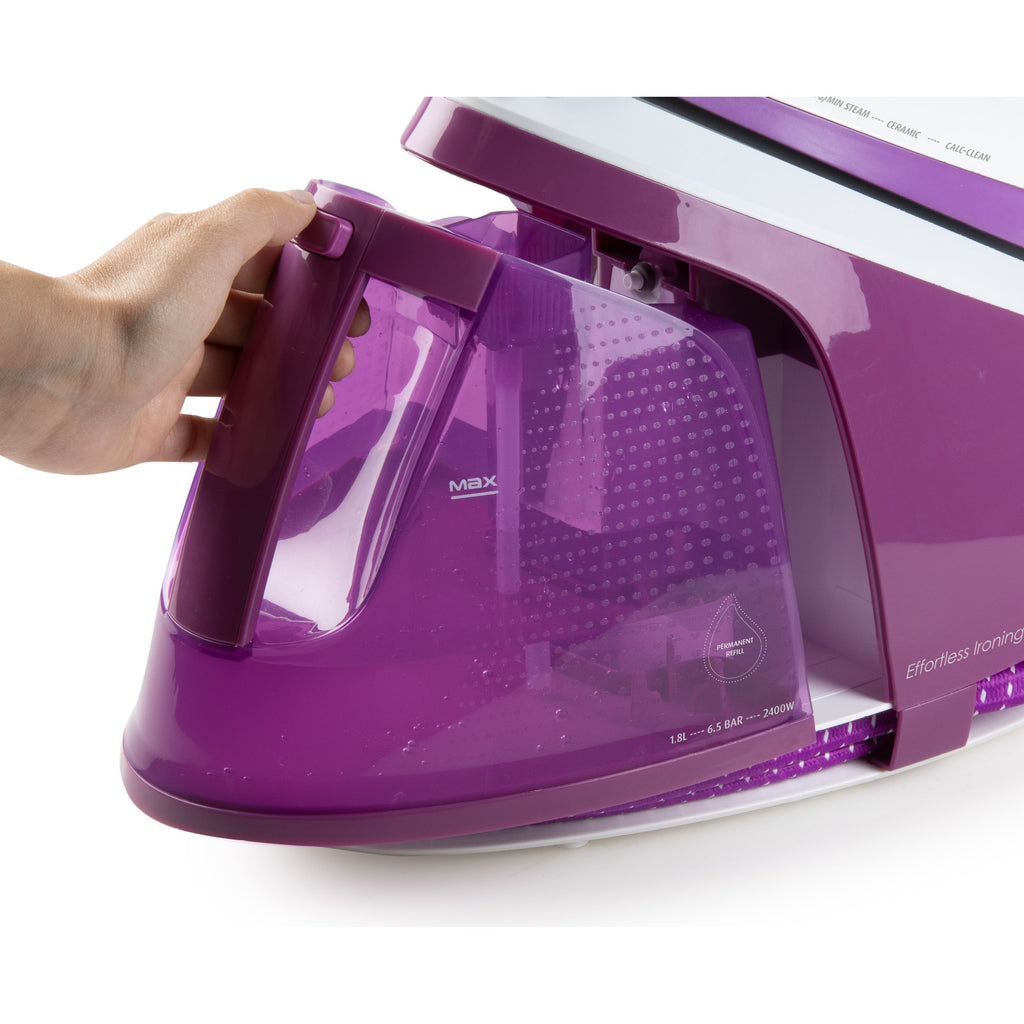• Großer Wassertank: Der herausnehmbare Wassertank mit einem Fassungsvermögen von 1,8 Litern ermöglicht langes, unterbrechungsfreies Bügeln.