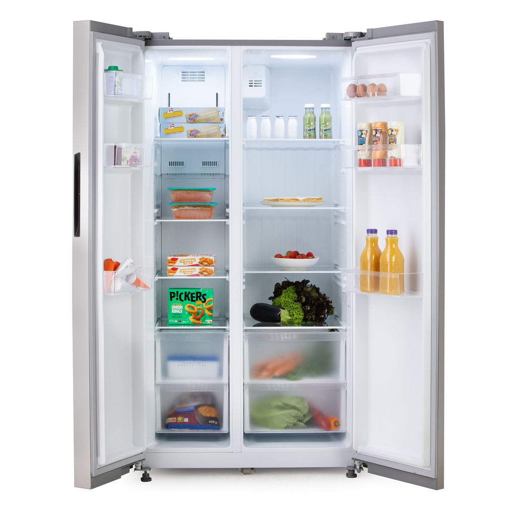 Mit einem Gesamtnutzinhalt von 555 Litern bietet dieses Side-by-Side-Gerät reichlich Platz für Frischeprodukte und Tiefkühlwaren. Der Kühlbereich mit 4 Glasablagen, 2 Frischefächern und 3 grossen Türablagen sorgt für optimale Übersicht und flexible Aufbewahrung. Im Gefrierteil stehen 4 Glasablagen, 2 Schubladen sowie 3 Türablagen zur Verfügung, sodass auch grössere Vorräte problemlos Platz finden. Das moderne No frost-System verhindert Eisbildung, während der Inverter-Kompressor für leisen Betrieb, geringen Energieverbrauch und eine lange Lebensdauer sorgt. Komfortfunktionen wie Super-Kühlen, Super-Gefrieren, Urlaubsmodus, Kindersicherung und ein Tür-Alarm runden die Ausstattung ab. Dank LED-Beleuchtung behalten Sie jederzeit den Überblick über Ihre Lebensmittel. Mit nur 37 dB Betriebslautstärke arbeitet das Foodcenter besonders leise – eine ideale Kombination aus Funktionalität, Design und Komfort.