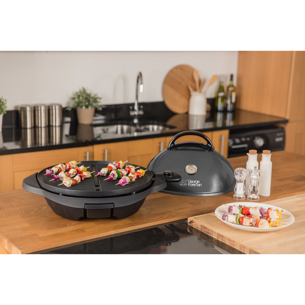 Der Universal-Grill eignet sich für die Innen- und Aussennutzung gleichermassen. Denn er kann zum einen als Tischgrill in den eigenen vier Wänden benutzt werden und zum anderen mit dem mitgelieferten Fuss im Freien. Für den Grillgenuss in grosser Runde verfügt der Universal-Grill über eine extra grosse Grillfläche, die Platz für bis zu 15 Portionen bietet. Das aussenliegende Thermometer zeigt die Temperatur während des Grillvorgangs an, wobei unter fünf verschiedenen Temperatureinstellungen gewählt werden kann. Die herausnehmbare Grillplatte besitzt eine hochwertige Antihaftbeschichtung. Für einen fettreduzierten Grillgenuss ist die Grillplatte speziell abgewinkelt und begünstigt so ein besseres Abfliessen von Fett und Öl, das sich in der herausnehmbaren Fettauffangschale sammelt.