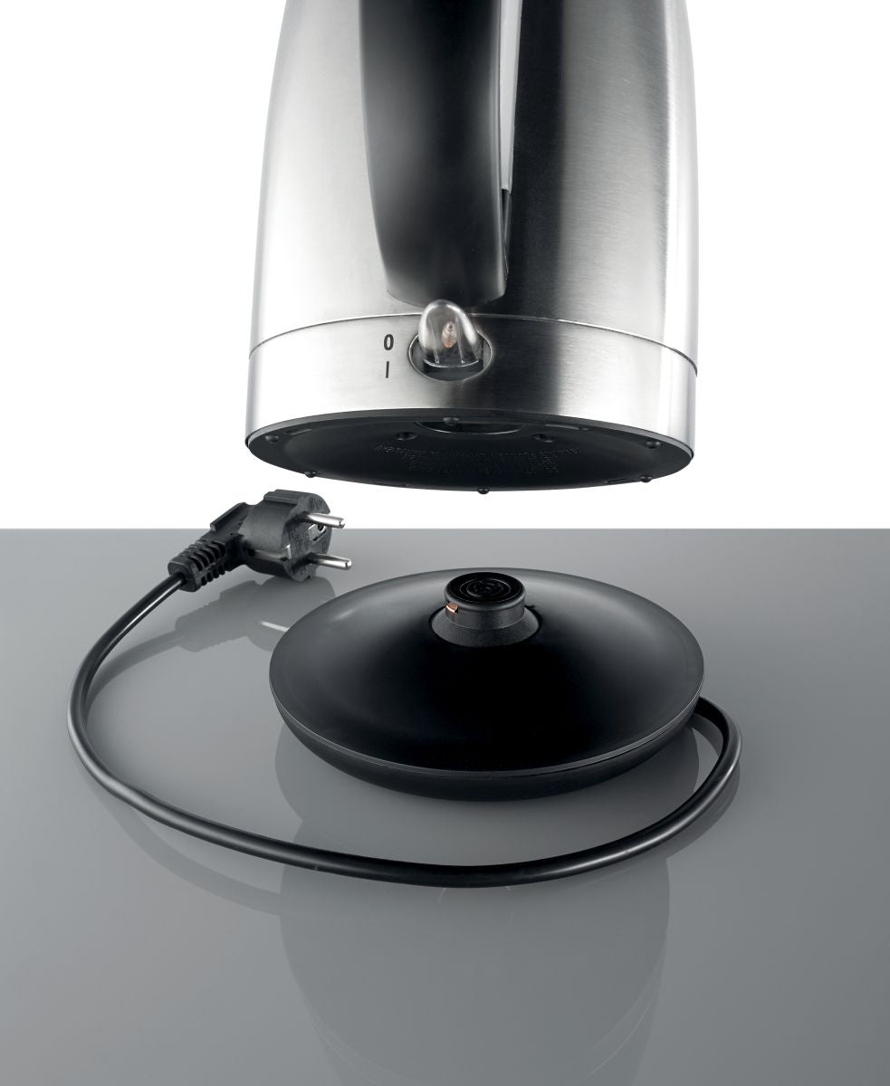 Edelstahl-Wasserkocher:2200 W Leistung1,7 L FassungsvermögenStrix-ThermostatWasserstandsanzeige unterhalb vom Griffherausnehmbarer und waschbarer KalkfilterEin-/Aus-Schalter mit roter Kontrollleuchte