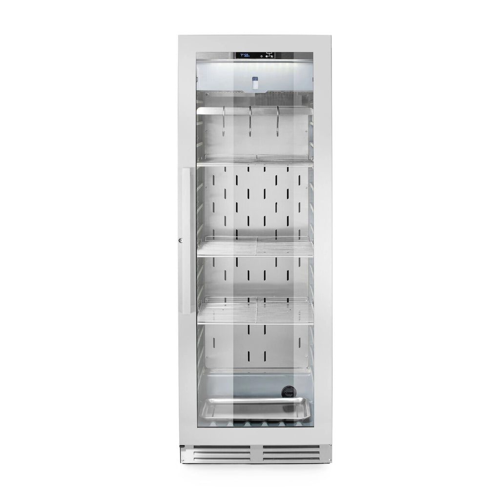 Mit einer Vielzahl von Ausstattungsmerkmalen wie Haken, Salzwanne und verstellbaren Regalen bietet dieser Fleischreifeschrank maximale Vielseitigkeit und Benutzerfreundlichkeit. Die Zwangskühlung mittels Ventilator und die LED-Beleuchtung gewährleisten eine gleichmäßige Luftzirkulation und optimale Sichtbarkeit im Schrankinneren.