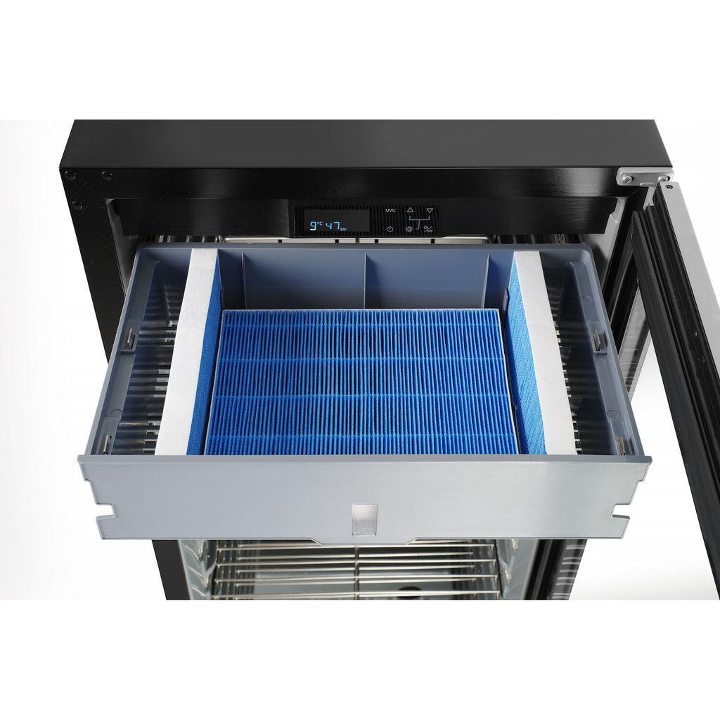 Die integrierte UVC-Sterilisationslampe verhindert die Bildung von Bakterien und sorgt für eine sichere Umgebung für das Fleisch. Optische und akustische Benachrichtigungen informieren den Benutzer über wichtige Bedingungen wie niedrige Luftfeuchtigkeit oder offene Tür, um eine optimale Reifung zu gewährleisten.