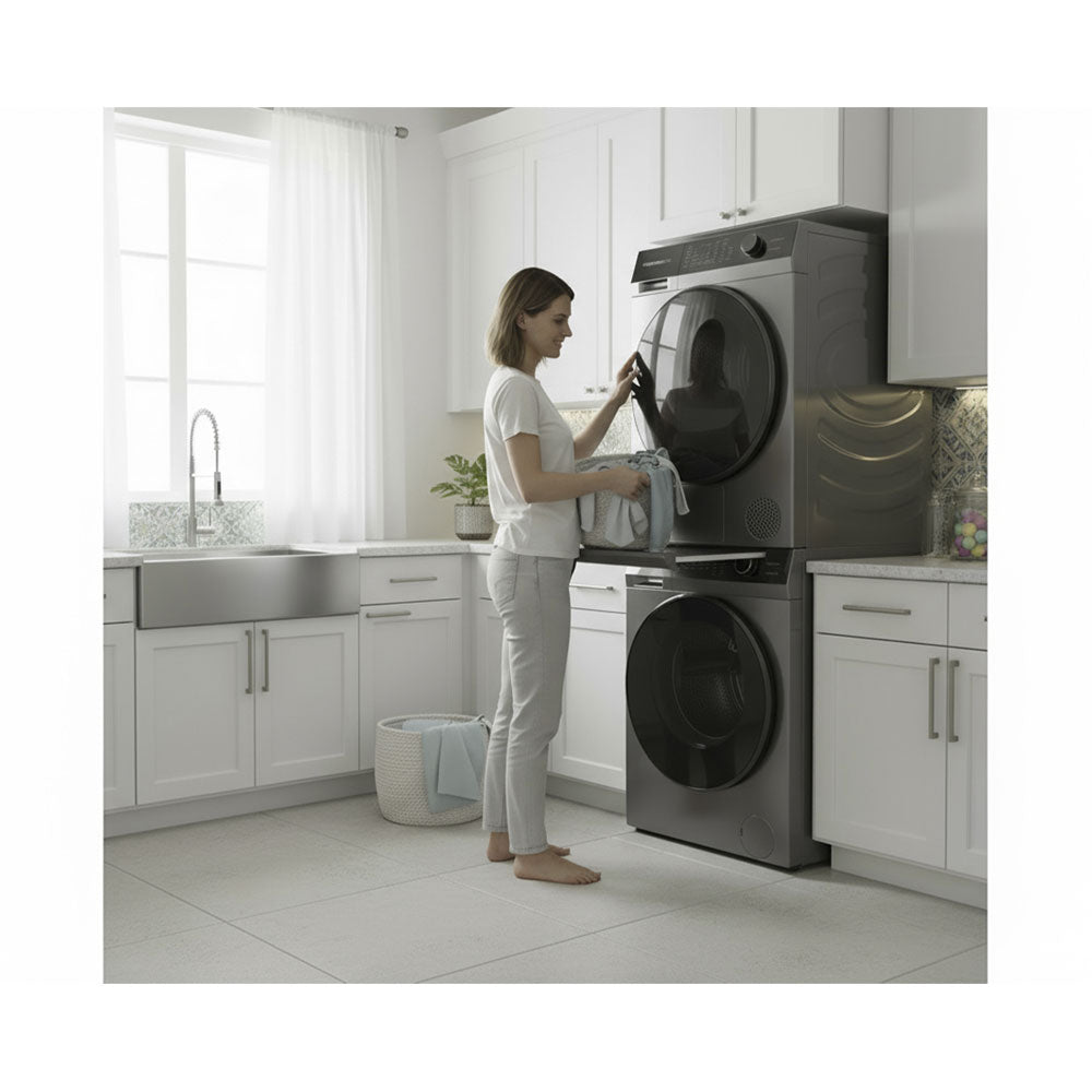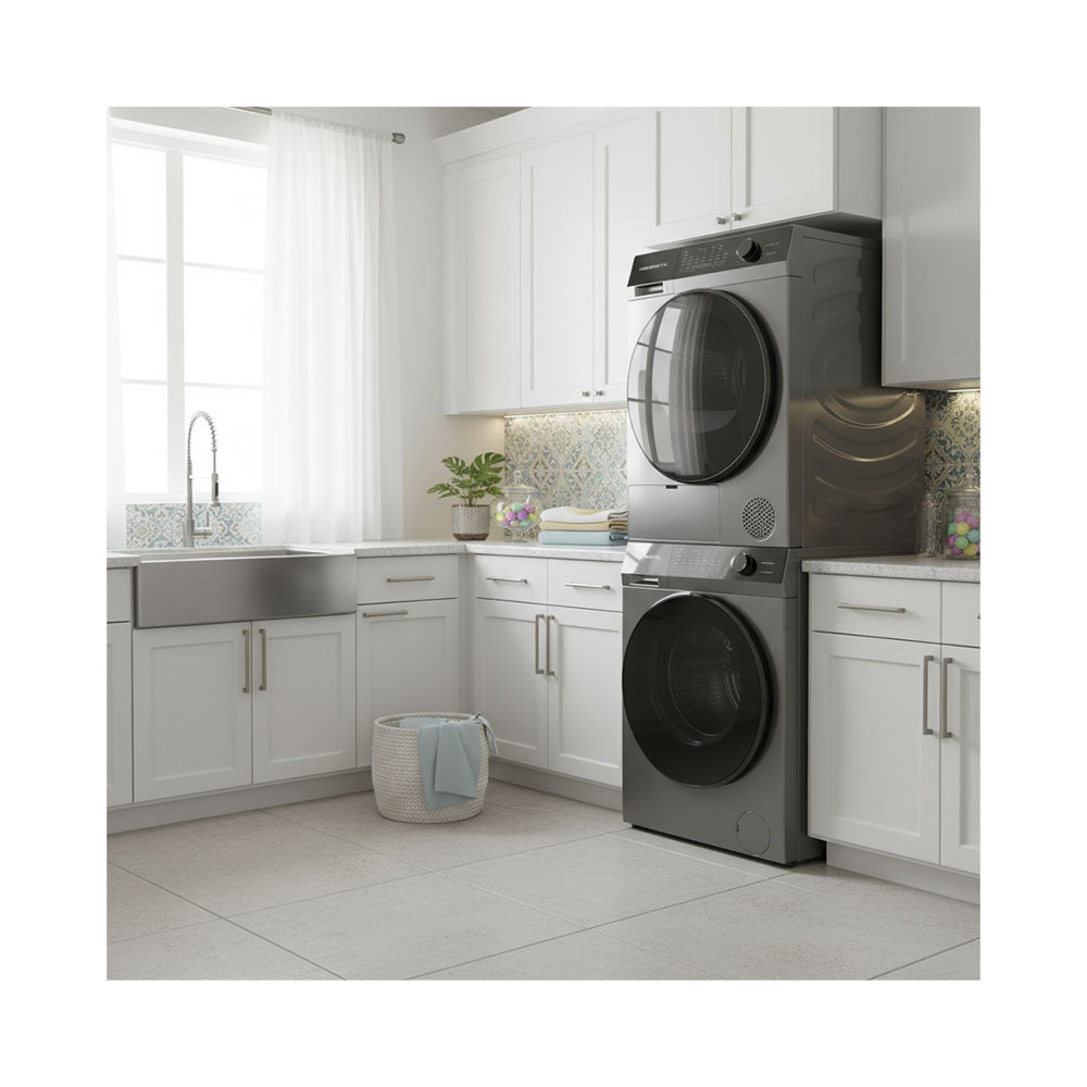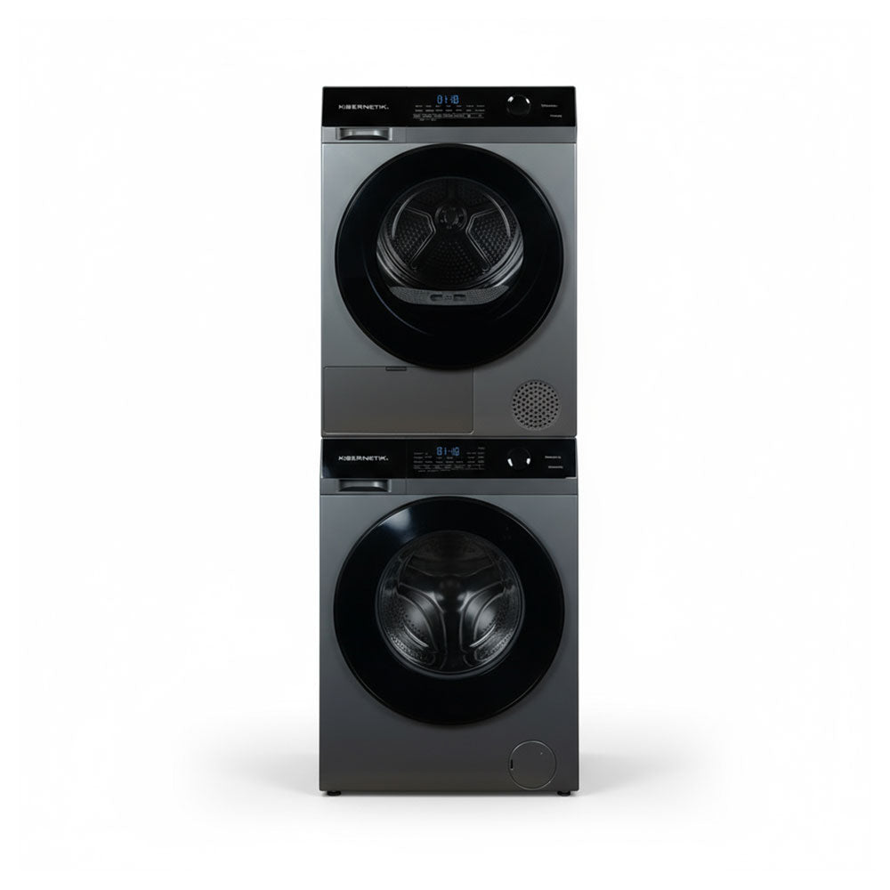 Der Kibernetik Waschturm vereint die leistungsstarke Waschmaschine mit dem effizienten Wärmepumpentrockner und bietet damit die perfekte Komplettlösung für Familien und grössere Haushalte. Mit 10 kg Waschkapazität und 9 kg Trockenvolumen überzeugt das Duo durch hohe Leistung, geringen Energieverbrauch und ein stilvolles Titangrau-Design. Die Waschmaschine arbeitet dank moderner Inverter-Technologie, Energieeffizienzklasse A und einem Verbrauch von nur 51 kWh pro 100 Zyklen besonders sparsam und leise. 14 Waschprogramme, darunter Eco 40–60 °C, Schnell 15 Min., Allergy Care sowie eine Dampffunktion, sorgen für hygienisch saubere, frische und glatte Wäsche. Mit bis zu 1400 U/min reduziert sich zudem die Trockenzeit erheblich. Der Wäschetrockner ergänzt die Waschmaschine ideal: Seine fortschrittliche Wärmepumpentechnologie und der AutoSense-Feuchtigkeitssensor beenden den Trocknungsprozess automatisch, sobald die Wäsche optimal getrocknet ist. Die reversierende Trommel mit LED-Innenbeleuchtung garantiert gleichmässige Ergebnisse und minimiert Knitterbildung. Mit 14 Trockenprogrammen, Knitterschutz, Zeitvorwahl und einem klaren LED-Display bietet der Trockner höchsten Bedienkomfort und schonende Textilpflege. Der Kibernetik Waschturm steht für effizientes Waschen und Trocknen, modernes Design und einfache Bedienung, ideal für alle, die Wert auf Qualität, Komfort und Energieeffizienz legen.