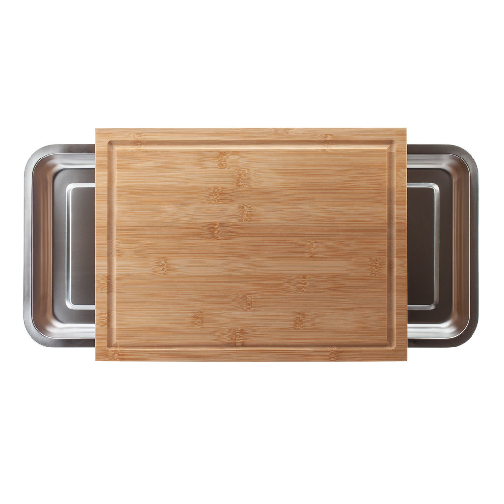 Dieses grosse und stabile Schneidebrett mit vier rutschfesten Füssen wird Ihr wertvoller täglicher Begleiter beim Schneiden aller Lebensmittel sein. Bambus, ein robustes und natürliches Material, garantiert Ihnen eine ausgezeichnete Langlebigkeit und eine einfache Pflege. BAMBOO ist mit zwei ausziehbaren Behältern aus hochwertigem Edelstahl 18/10 ausgestattet, in denen Obst und Gemüse oder Schalen gesammelt werden können. Sie sind elegant und können auch alsPräsentationsschalen verwendet werden. Seine Grösse ermöglicht das Schneiden von schönen Fleischstücken, es ist mit Rillen zum Auffangen von Säften ausgestattetBAMBOO: Das Schneidebrett, das Ihnen das Leben im Alltag erleichtert