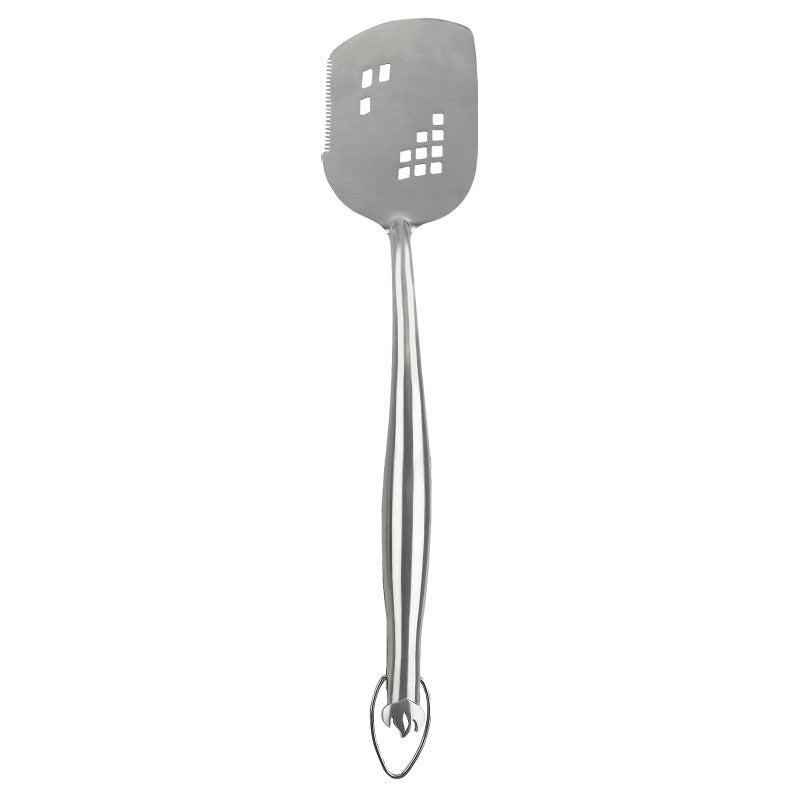 Der überdimensionierte Grillwender ist auf Beständigkeit ausgelegt und fängt auch nach intensivem Einsatz nicht an zu rosten. der gezahnte Rand sorgt dafür, dass das Grillgut immer perfekt aufliegt.